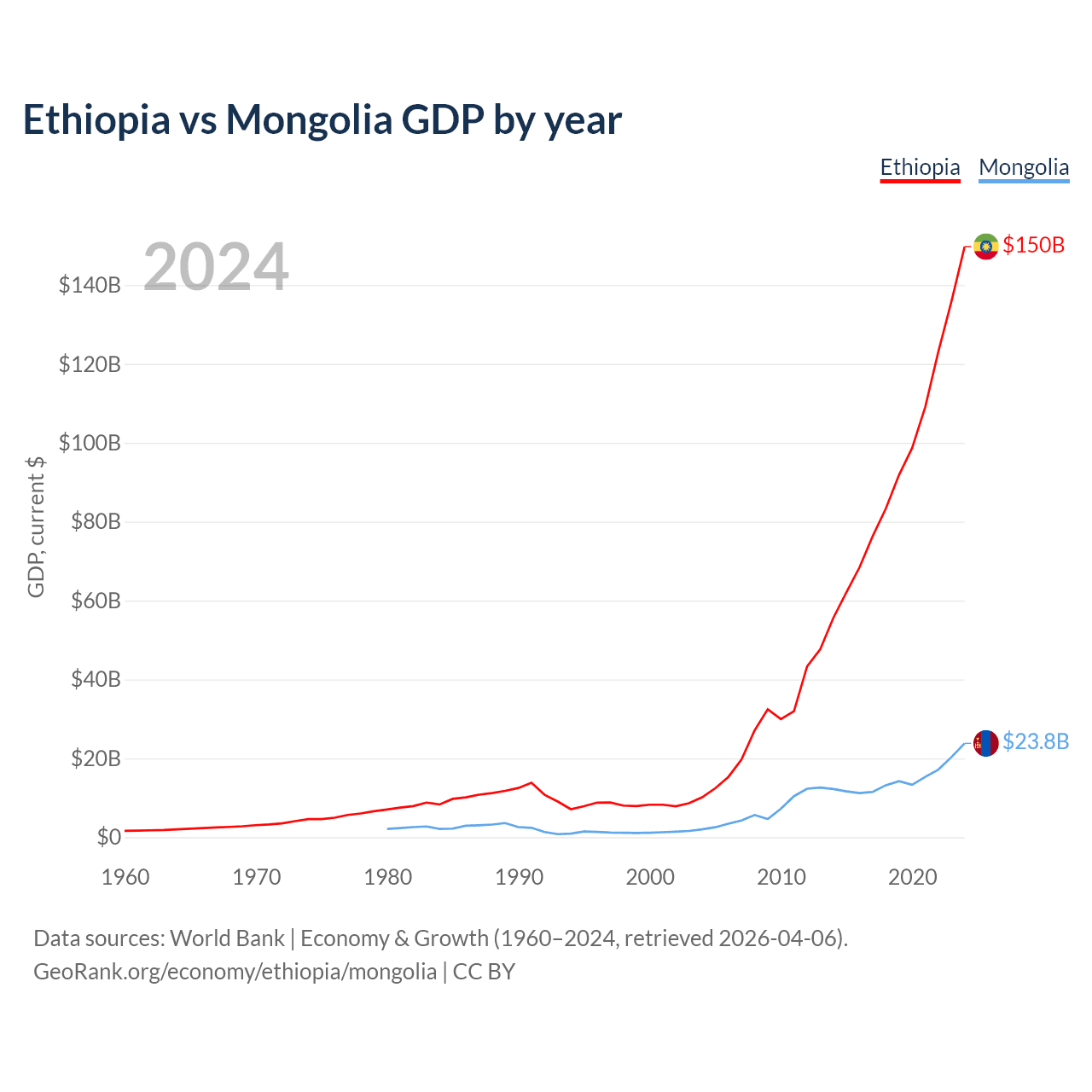 Ethiopia has a GDP of $150B compared to $23.8B for Mongolia, ranking 60/197 and 121/197 by economy size, respectively.