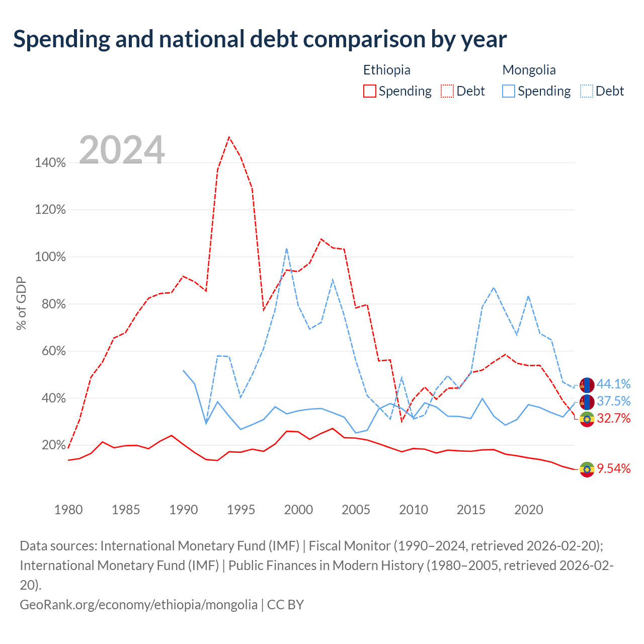 Ethiopia has $48.9B in government debt (32.7% of GDP), compared to $10.5B (44.1% of GDP) in Mongolia.