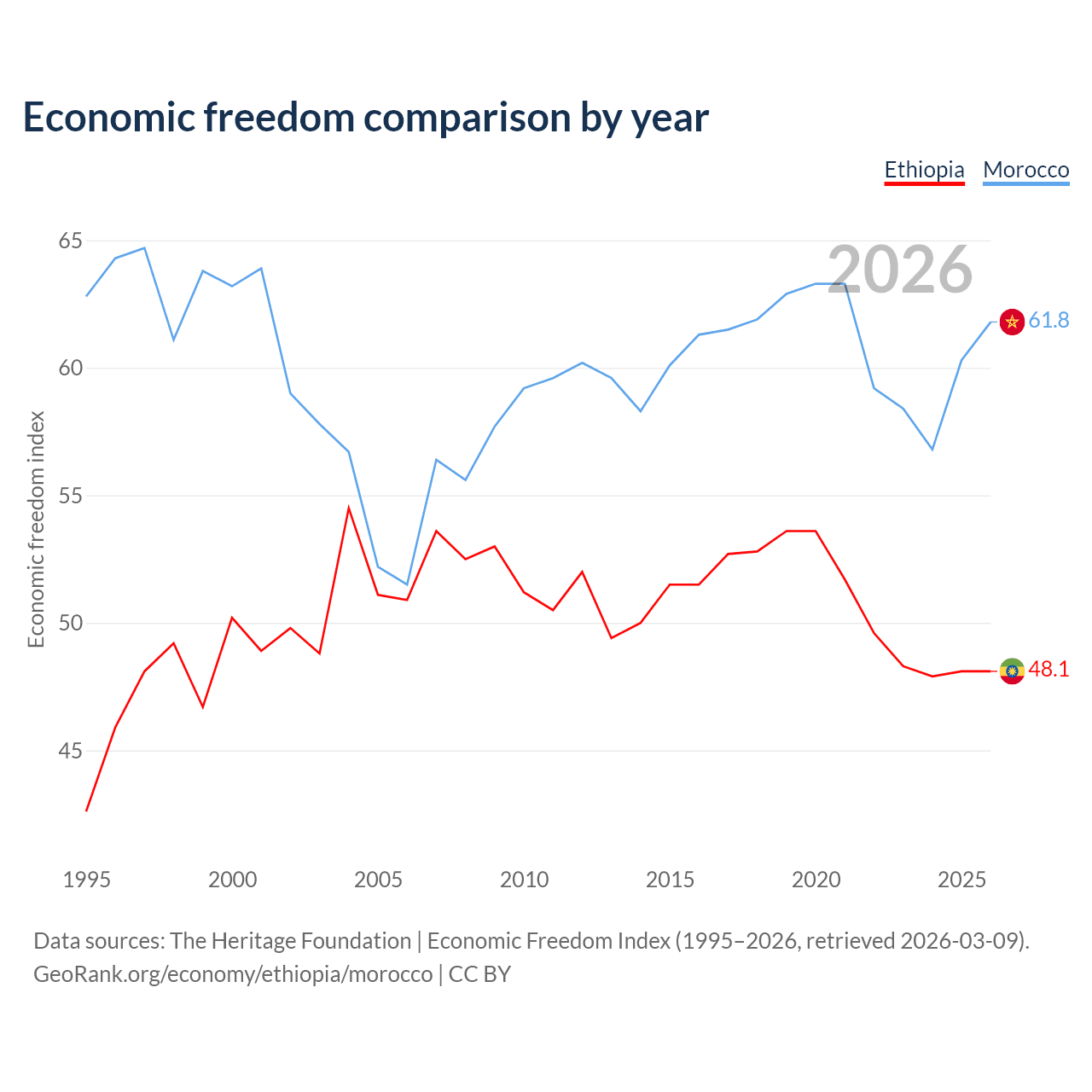 The Economic Freedom Index for Ethiopia is 48.1, ranking 171/197, compared to 61.8 for Morocco, ranking 91/197. The chart above displays a comparison of annual changes in economic freedom indexes.