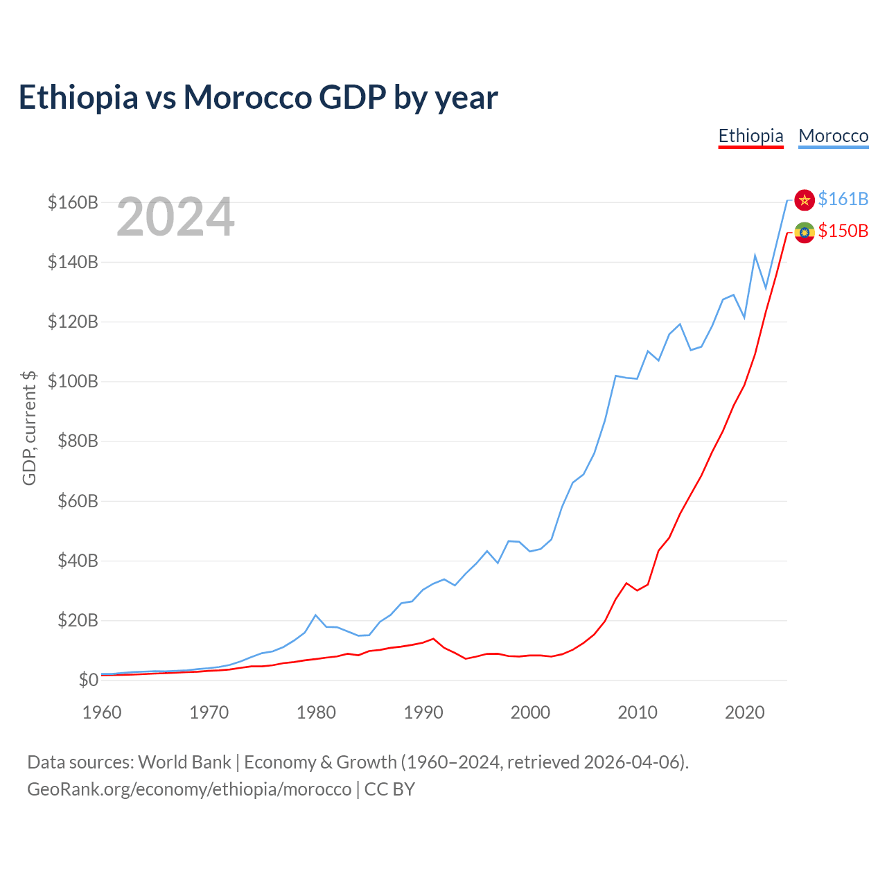 Ethiopia has a GDP of $150B compared to $161B for Morocco, ranking 60/197 and 58/197 by economy size, respectively.