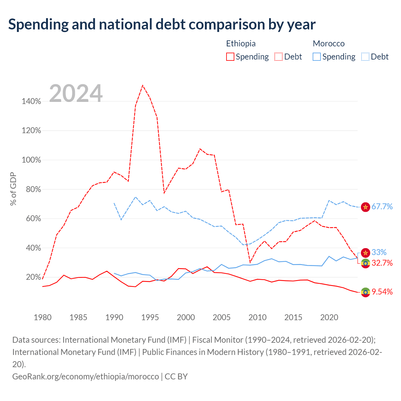 Ethiopia has $48.9B in government debt (32.7% of GDP), compared to $109B (67.7% of GDP) in Morocco.