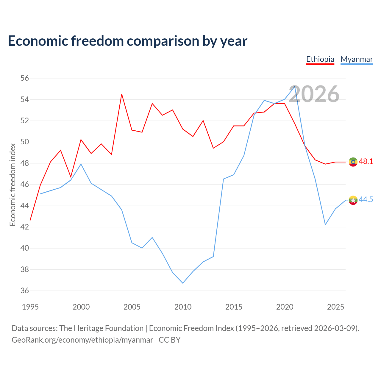 The Economic Freedom Index for Ethiopia is 48.1, ranking 171/197, compared to 44.5 for Myanmar, ranking 180/197. The chart above displays a comparison of annual changes in economic freedom indexes.