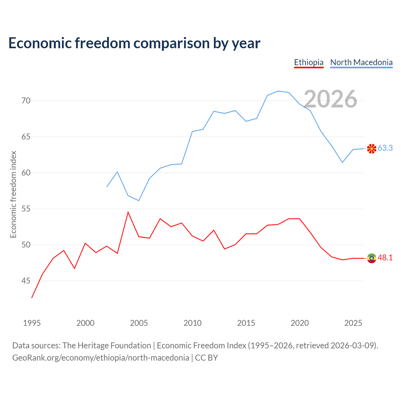 The Economic Freedom Index for Ethiopia is 48.1, ranking 171/197, compared to 63.3 for North Macedonia, ranking 81/197. The chart above displays a comparison of annual changes in economic freedom indexes.