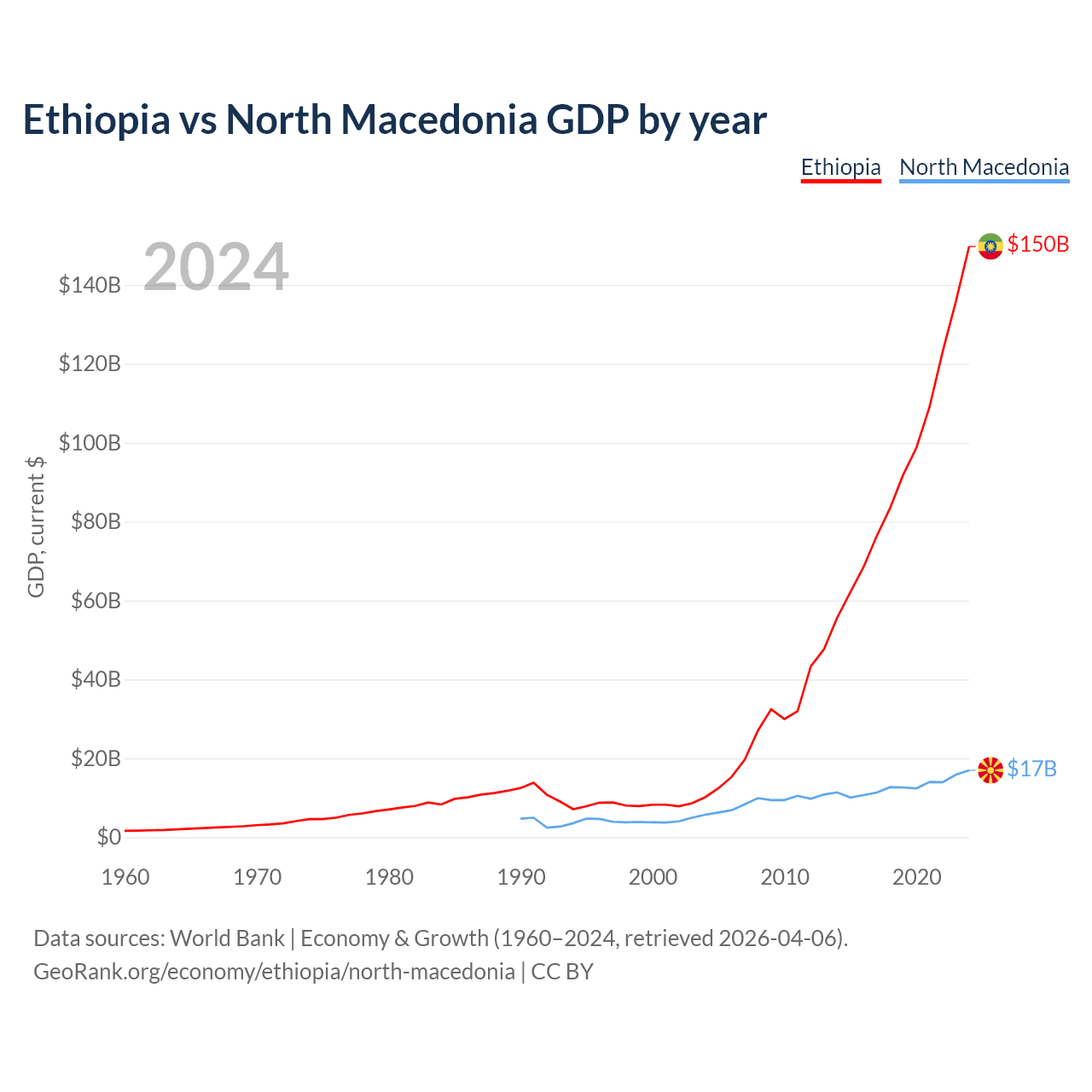 Ethiopia has a GDP of $150B compared to $17B for North Macedonia, ranking 60/197 and 138/197 by economy size, respectively.