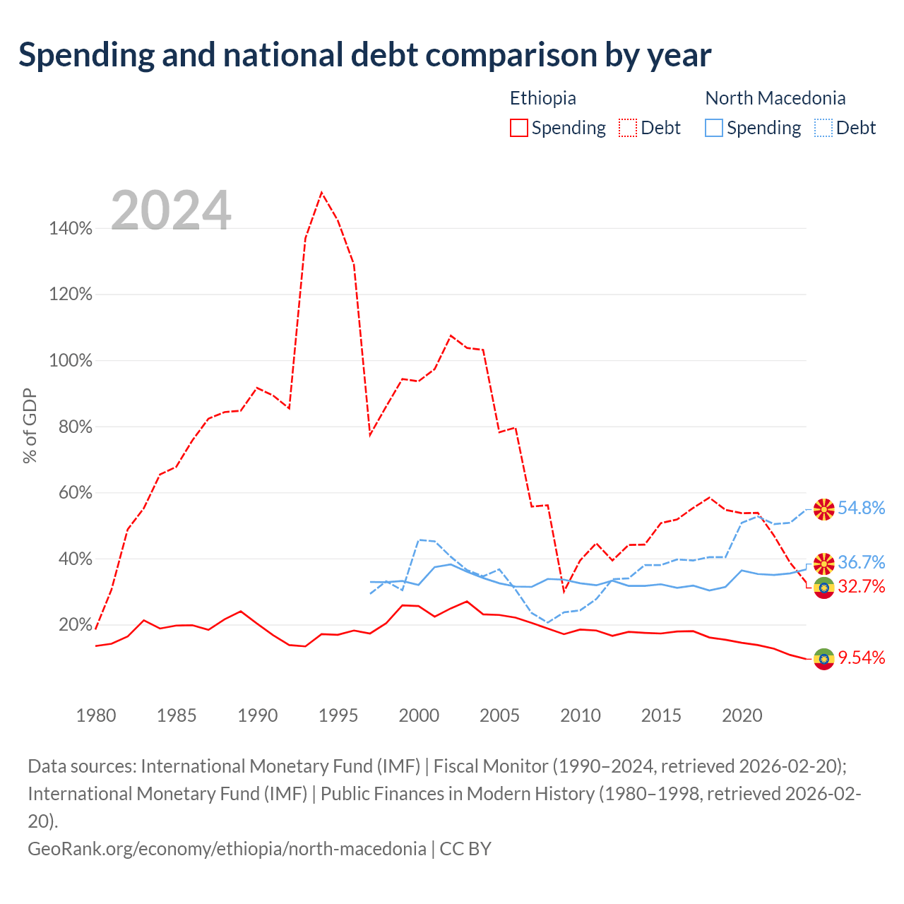 Ethiopia has $48.9B in government debt (32.7% of GDP), compared to $9.3B (54.8% of GDP) in North Macedonia.
