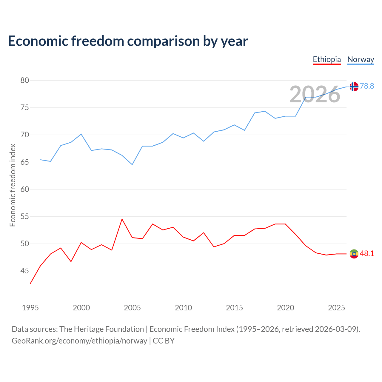 The Economic Freedom Index for Ethiopia is 48.1, ranking 171/197, compared to 78.8 for Norway, ranking 9/197. The chart above displays a comparison of annual changes in economic freedom indexes.
