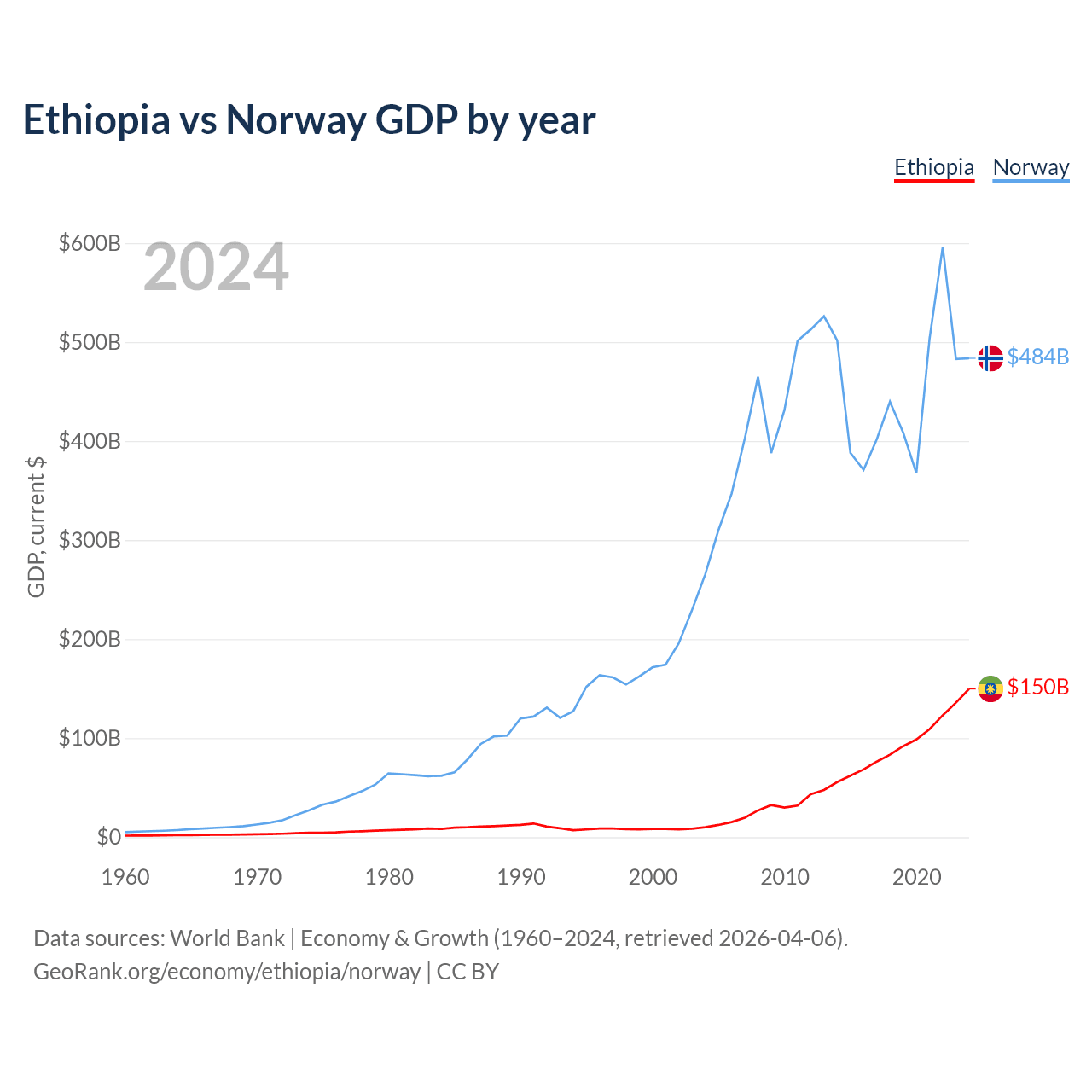 Ethiopia has a GDP of $150B compared to $484B for Norway, ranking 60/197 and 32/197 by economy size, respectively.