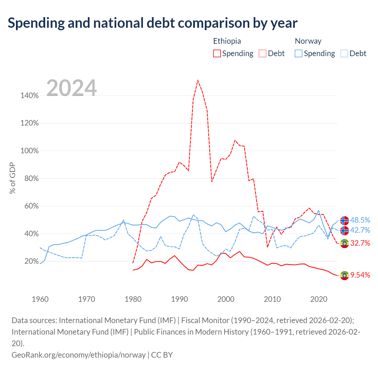 Ethiopia has $48.9B in government debt (32.7% of GDP), compared to $207B (42.7% of GDP) in Norway.