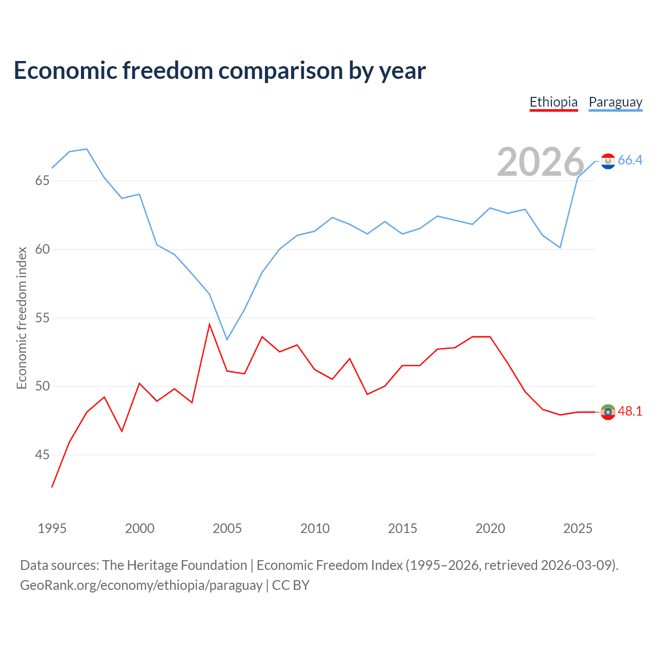 The Economic Freedom Index for Ethiopia is 48.1, ranking 171/197, compared to 66.4 for Paraguay, ranking 61/197. The chart above displays a comparison of annual changes in economic freedom indexes.