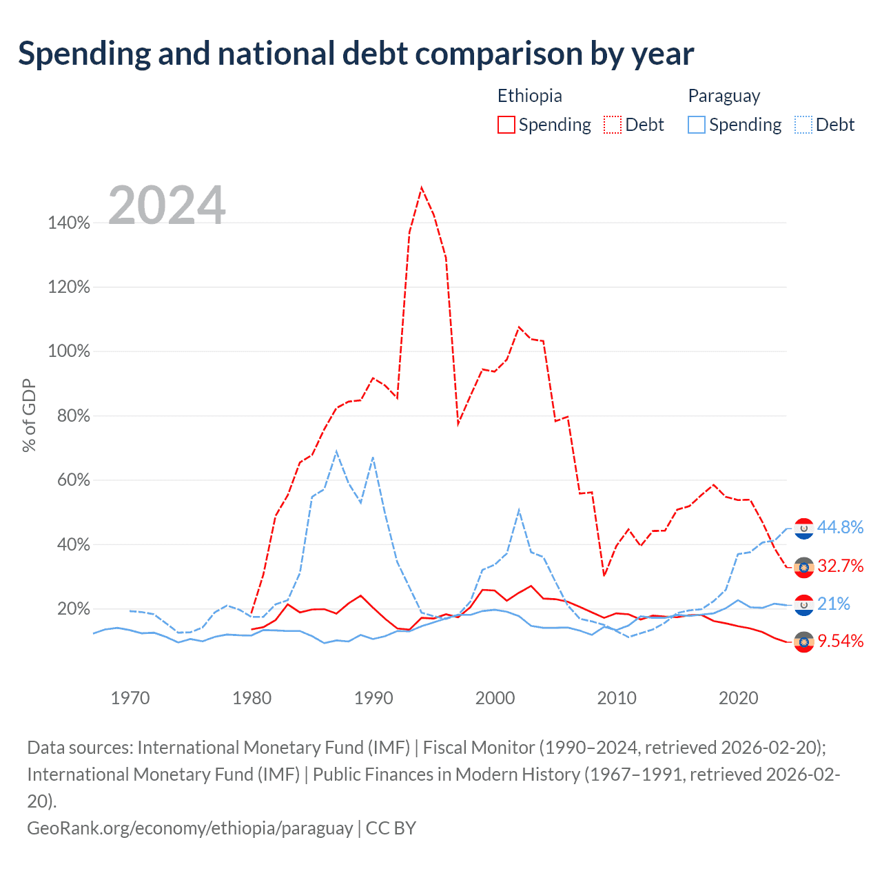 Ethiopia has $48.9B in government debt (32.7% of GDP), compared to $19.9B (44.8% of GDP) in Paraguay.