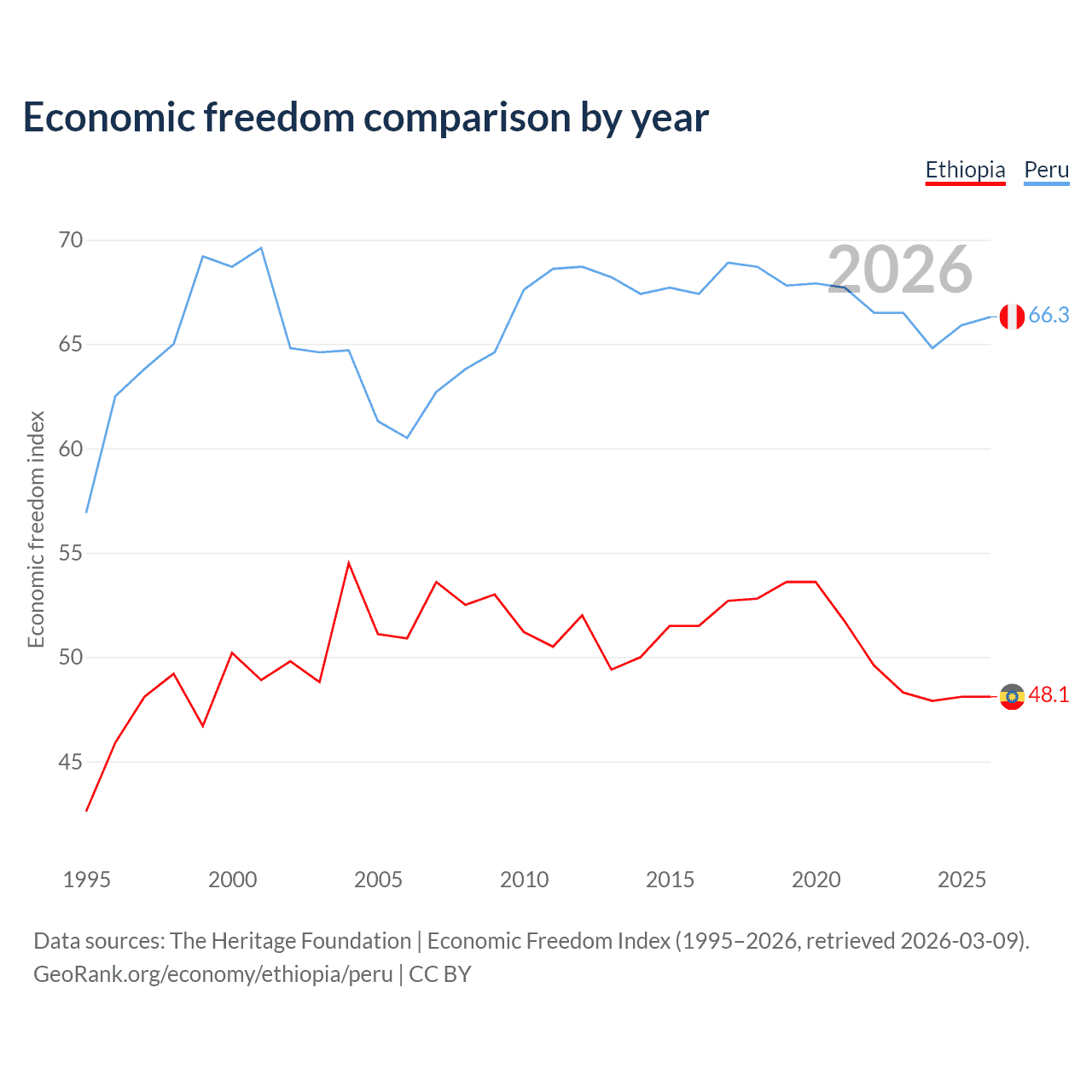 The Economic Freedom Index for Ethiopia is 48.1, ranking 171/197, compared to 66.3 for Peru, ranking 62/197. The chart above displays a comparison of annual changes in economic freedom indexes.