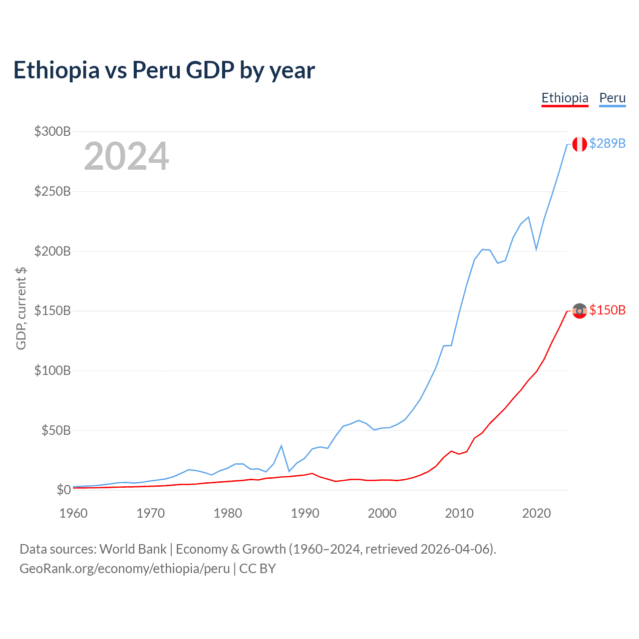 Ethiopia has a GDP of $150B compared to $289B for Peru, ranking 60/197 and 49/197 by economy size, respectively.
