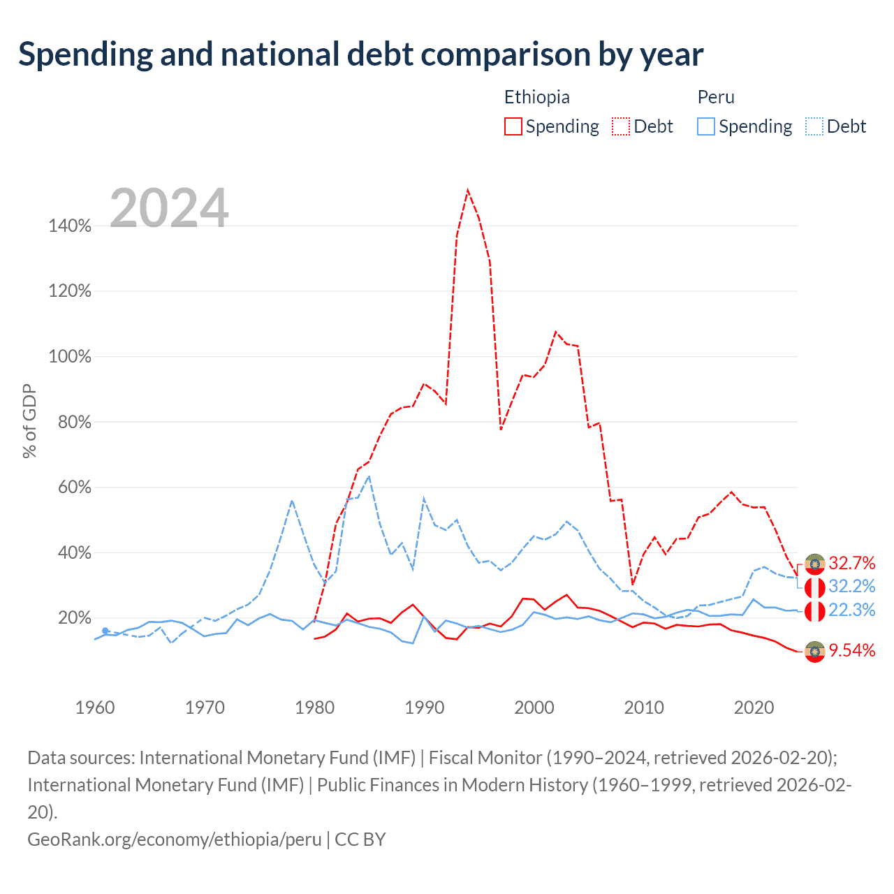 Ethiopia has $48.9B in government debt (32.7% of GDP), compared to $93B (32.2% of GDP) in Peru.