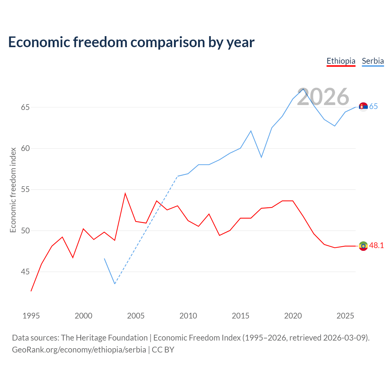 The Economic Freedom Index for Ethiopia is 48.1, ranking 171/197, compared to 65 for Serbia, ranking 68/197. The chart above displays a comparison of annual changes in economic freedom indexes.