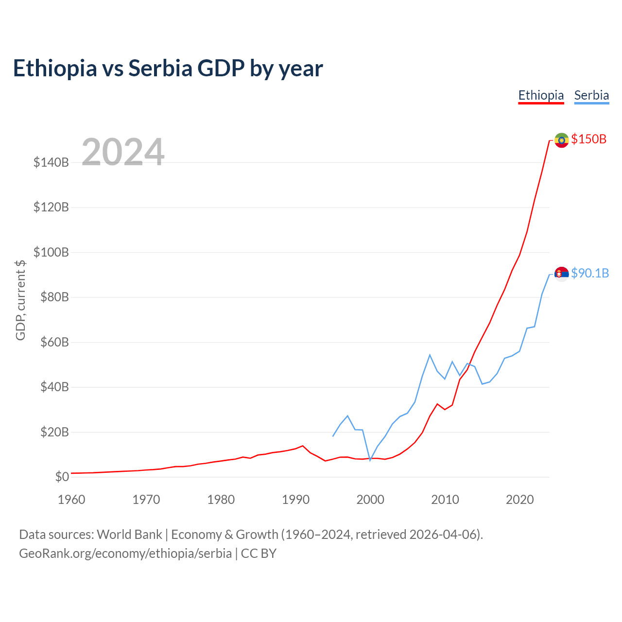 Ethiopia has a GDP of $150B compared to $90.1B for Serbia, ranking 60/197 and 76/197 by economy size, respectively.