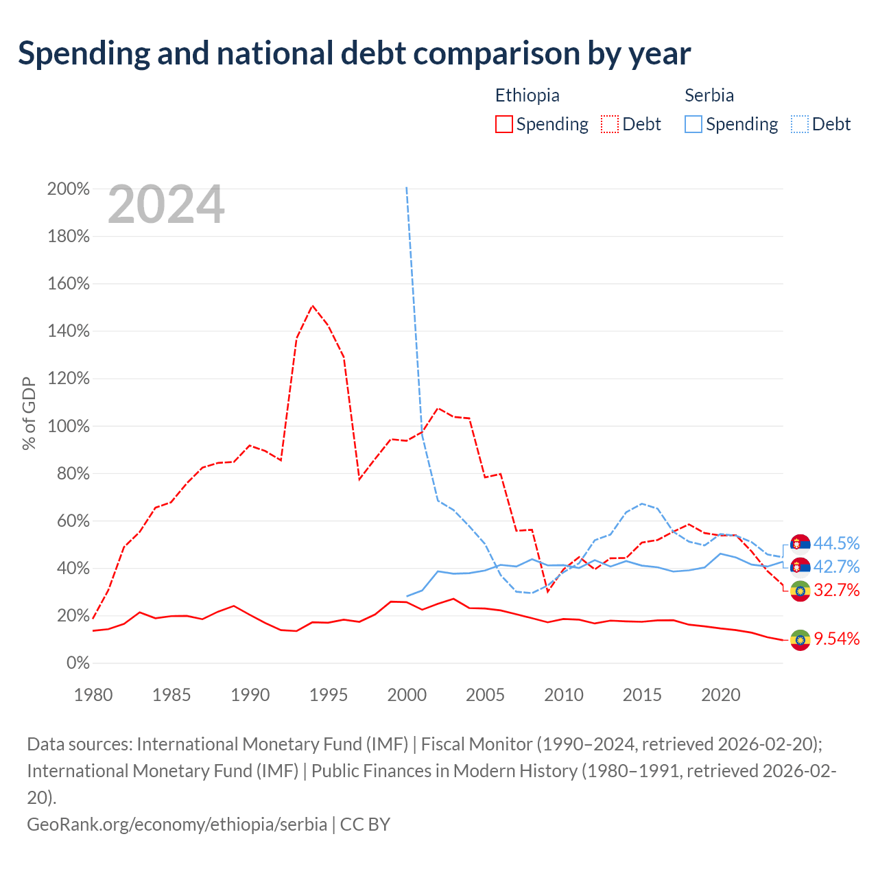 Ethiopia has $48.9B in government debt (32.7% of GDP), compared to $40.1B (44.5% of GDP) in Serbia.