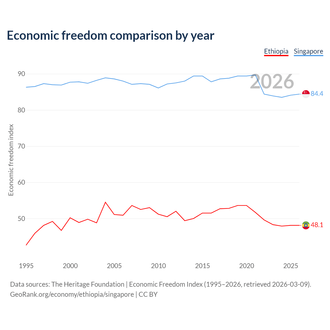 The Economic Freedom Index for Ethiopia is 48.1, ranking 171/197, compared to 84.4 for Singapore, ranking 1/197. The chart above displays a comparison of annual changes in economic freedom indexes.