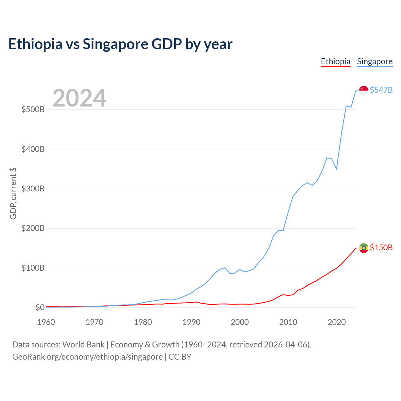 Ethiopia has a GDP of $150B compared to $547B for Singapore, ranking 60/197 and 28/197 by economy size, respectively.
