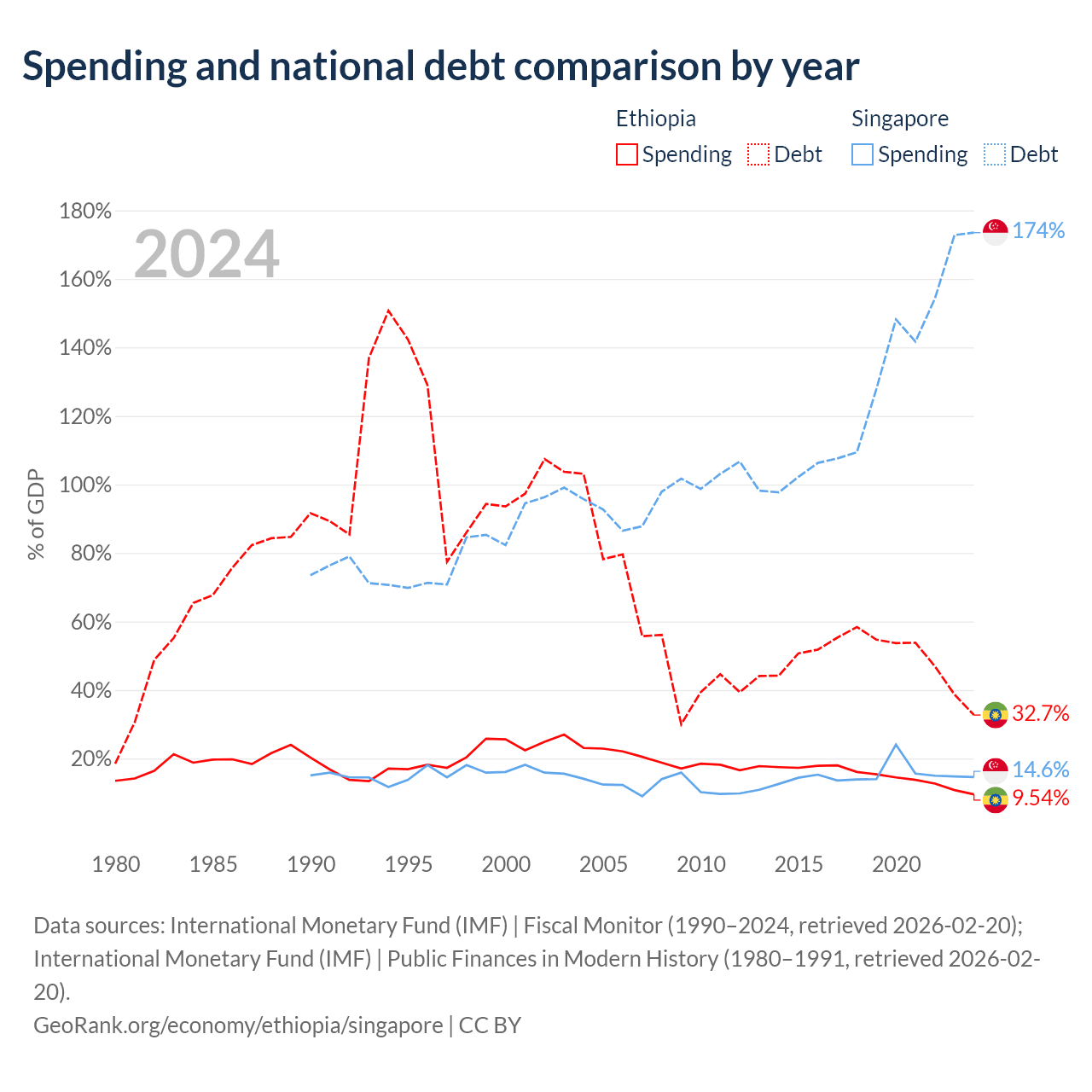 Ethiopia has $48.9B in government debt (32.7% of GDP), compared to $950B (173.5% of GDP) in Singapore.