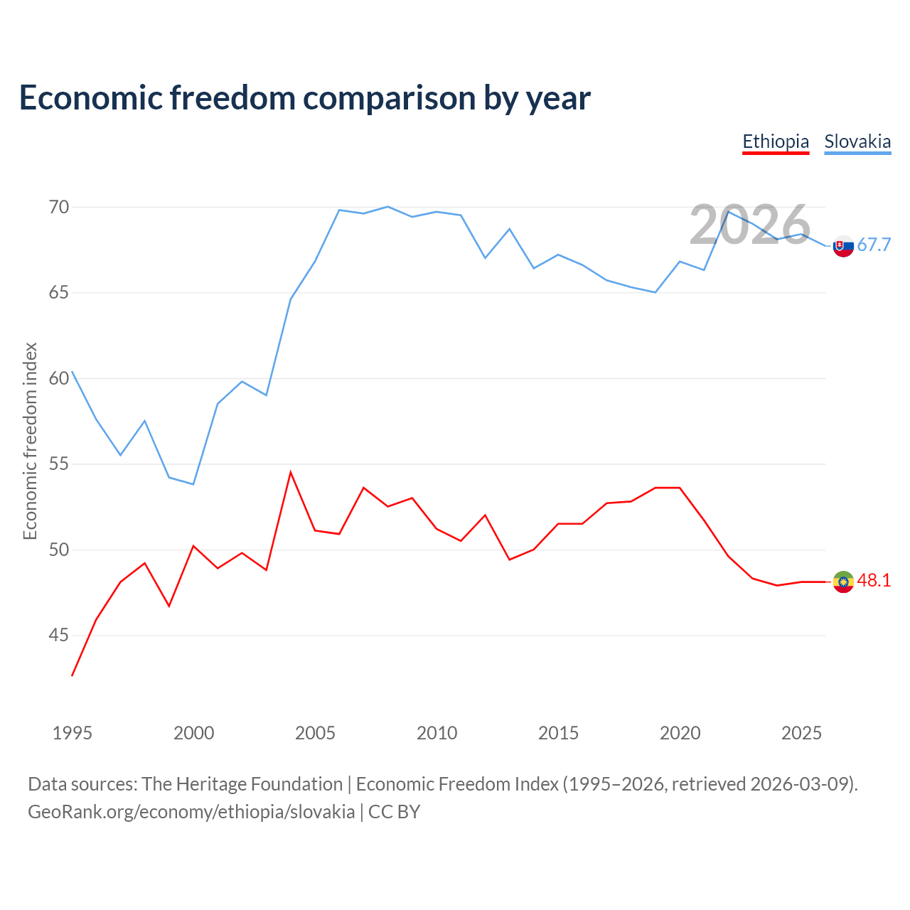 The Economic Freedom Index for Ethiopia is 48.1, ranking 171/197, compared to 67.7 for Slovakia, ranking 54/197. The chart above displays a comparison of annual changes in economic freedom indexes.
