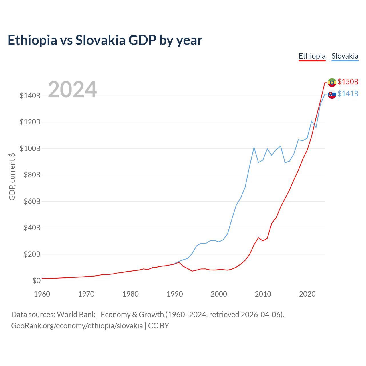 Ethiopia has a GDP of $150B compared to $141B for Slovakia, ranking 60/197 and 61/197 by economy size, respectively.