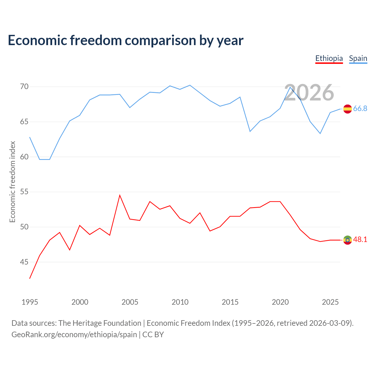 The Economic Freedom Index for Ethiopia is 48.1, ranking 171/197, compared to 66.8 for Spain, ranking 59/197. The chart above displays a comparison of annual changes in economic freedom indexes.