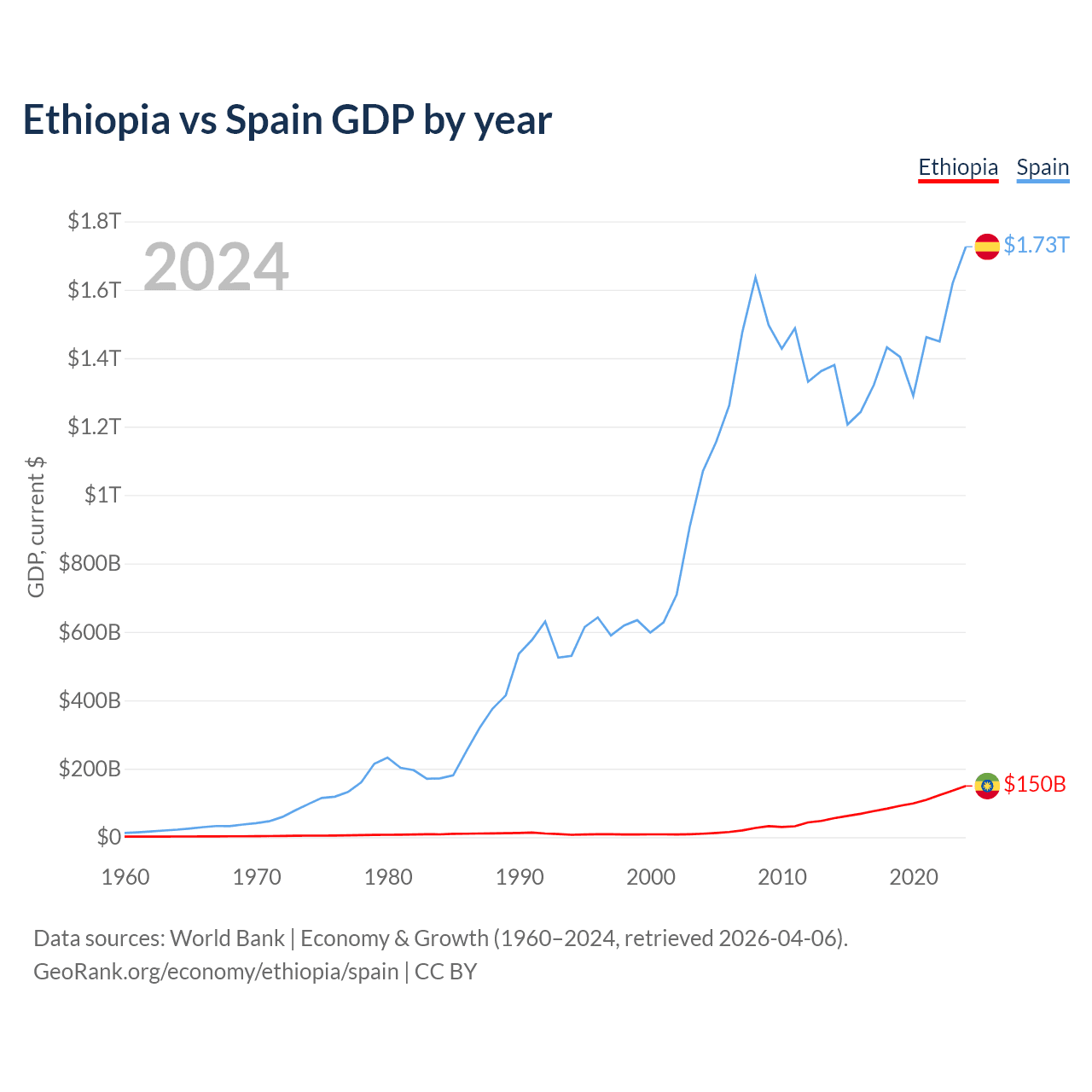 Ethiopia has a GDP of $150B compared to $1.73T for Spain, ranking 60/197 and 15/197 by economy size, respectively.