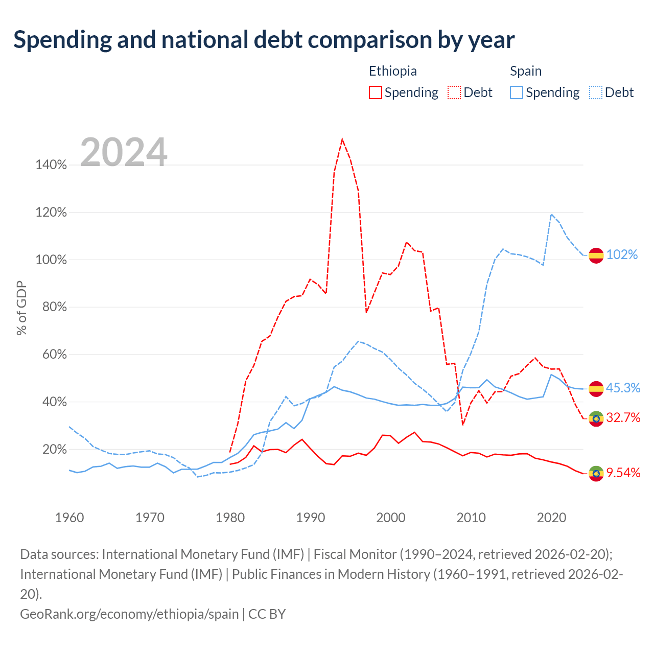 Ethiopia has $48.9B in government debt (32.7% of GDP), compared to $1.75T (101.6% of GDP) in Spain.