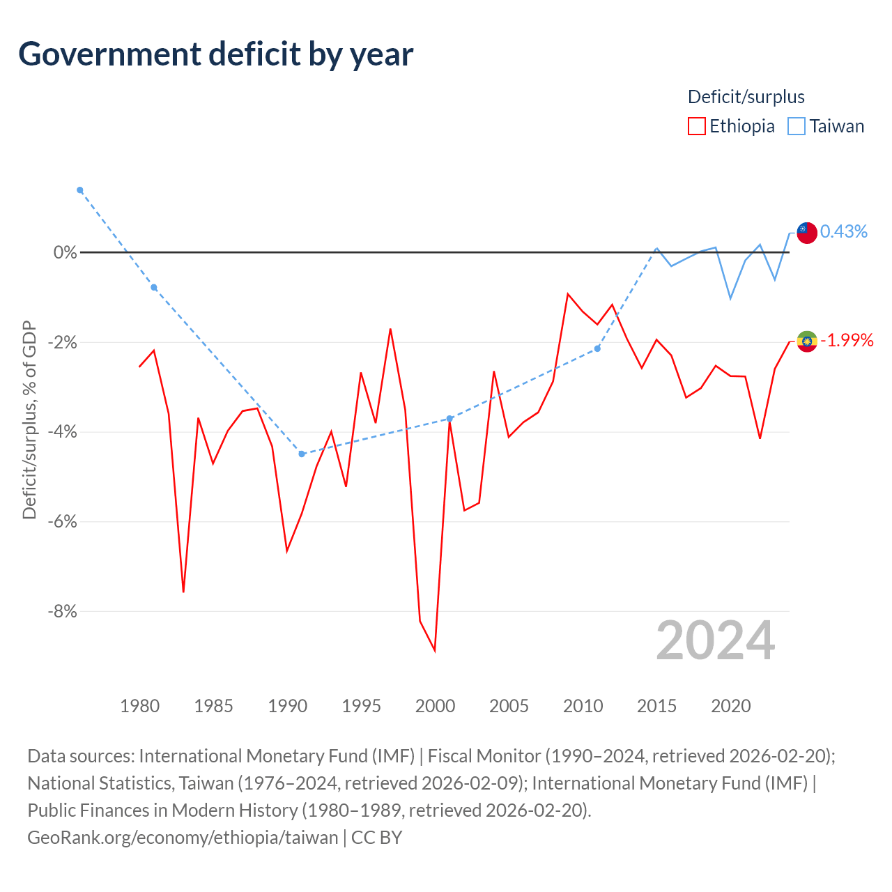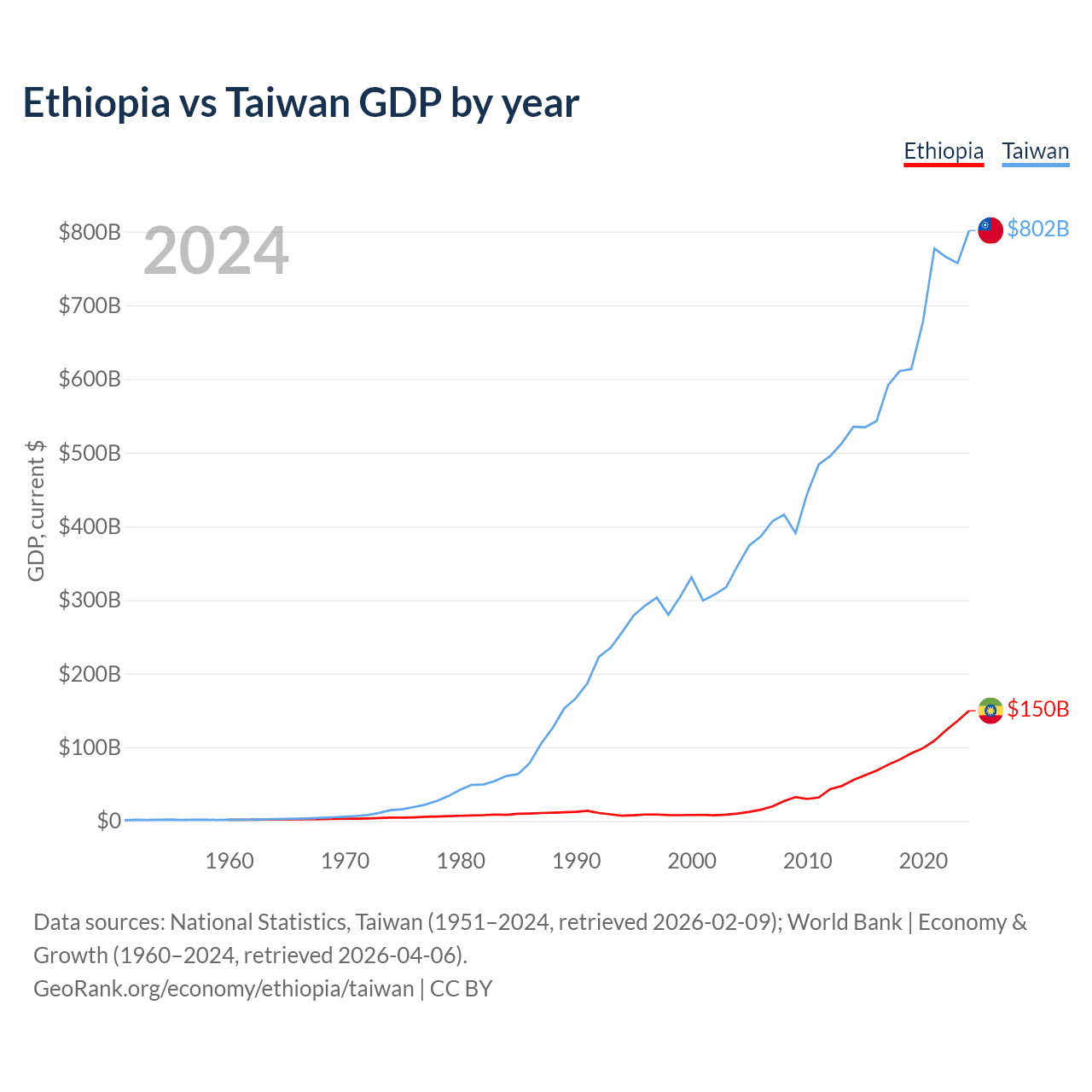 Ethiopia has a GDP of $150B compared to $802B for Taiwan, ranking 60/197 and 22/197 by economy size, respectively.