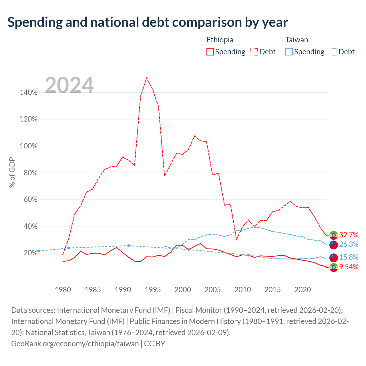 Ethiopia has $48.9B in government debt (32.7% of GDP), compared to $211B (26.3% of GDP) in Taiwan.