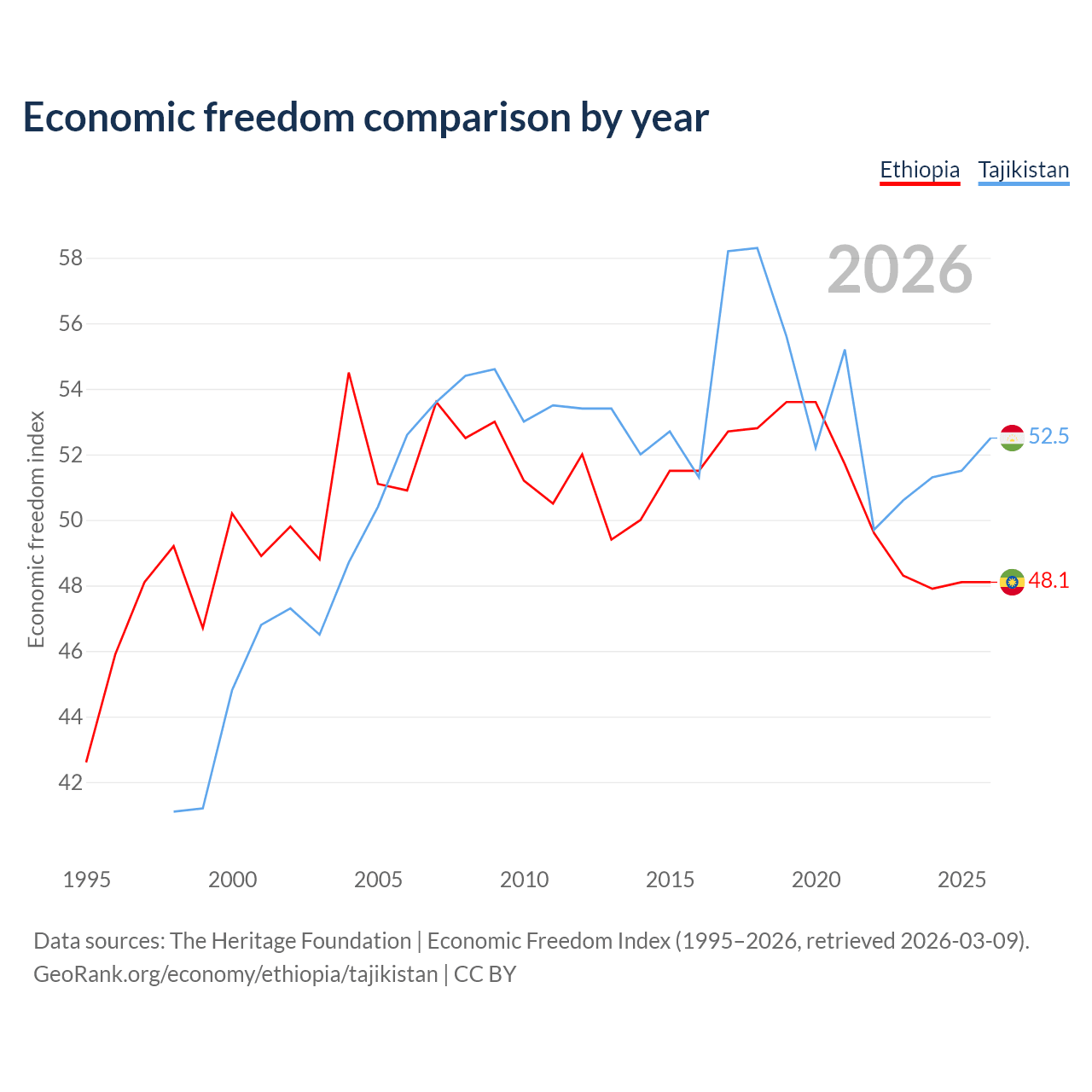 The Economic Freedom Index for Ethiopia is 48.1, ranking 171/197, compared to 52.5 for Tajikistan, ranking 147/197. The chart above displays a comparison of annual changes in economic freedom indexes.