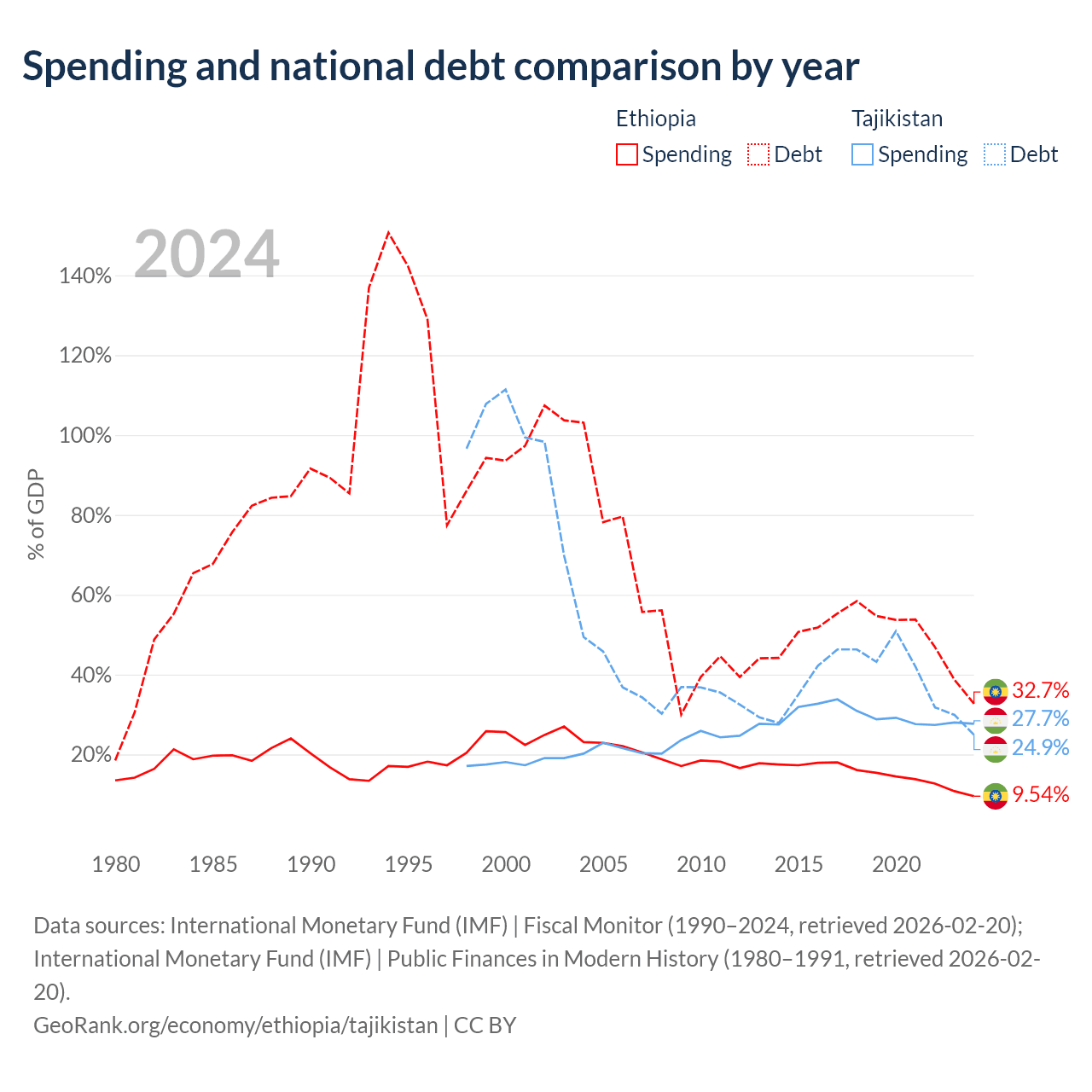 Ethiopia has $48.9B in government debt (32.7% of GDP), compared to $3.54B (24.9% of GDP) in Tajikistan.