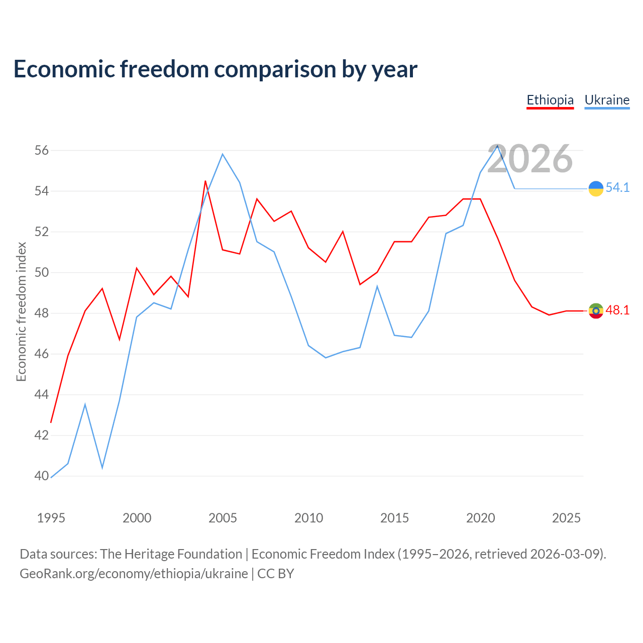 The Economic Freedom Index for Ethiopia is 48.1, ranking 171/197, compared to 54.1 for Ukraine, ranking 135/197. The chart above displays a comparison of annual changes in economic freedom indexes.
