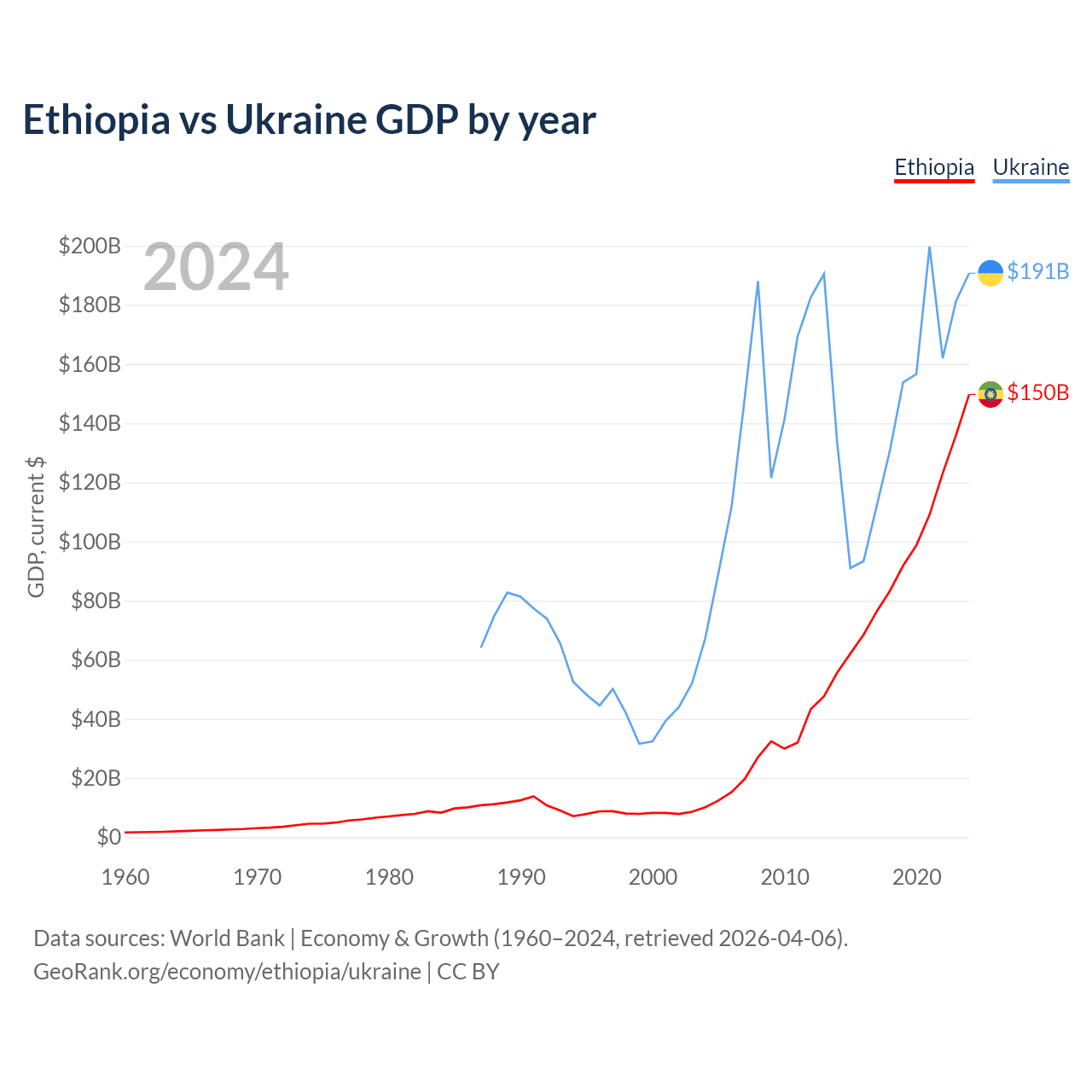 Ethiopia has a GDP of $150B compared to $191B for Ukraine, ranking 60/197 and 57/197 by economy size, respectively.