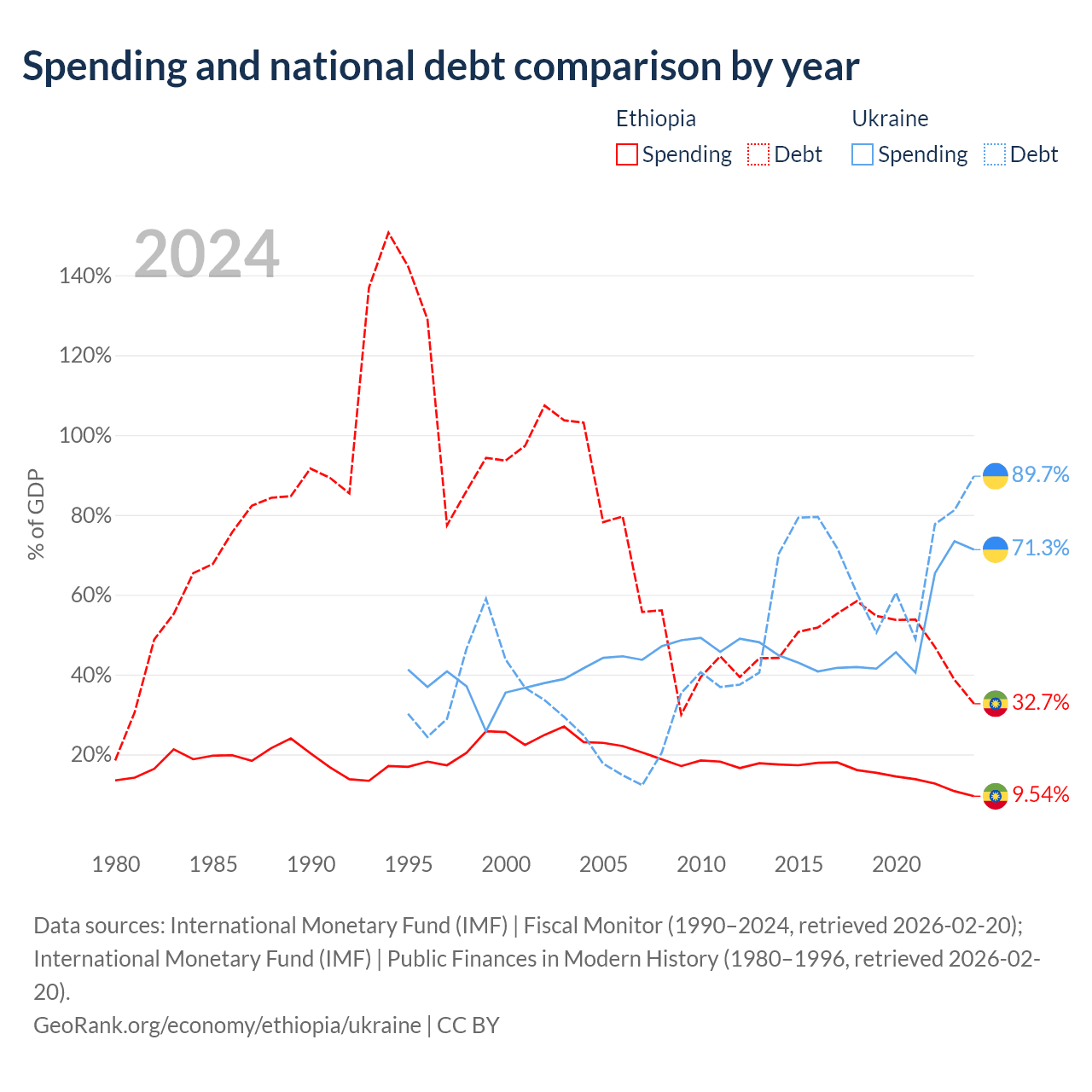 Ethiopia has $48.9B in government debt (32.7% of GDP), compared to $171B (89.7% of GDP) in Ukraine.