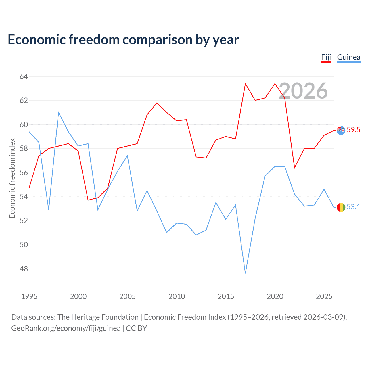 The Economic Freedom Index for Fiji is 59.5, ranking 103/197, compared to 53.1 for Guinea, ranking 141/197. The chart above displays a comparison of annual changes in economic freedom indexes.