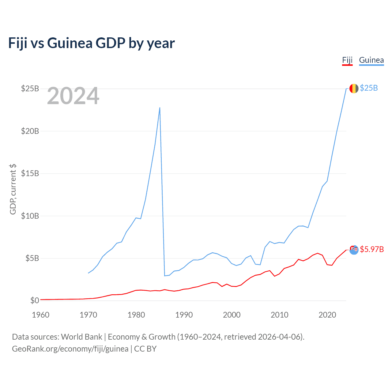 Fiji has a GDP of $5.97B compared to $25B for Guinea, ranking 161/197 and 118/197 by economy size, respectively.