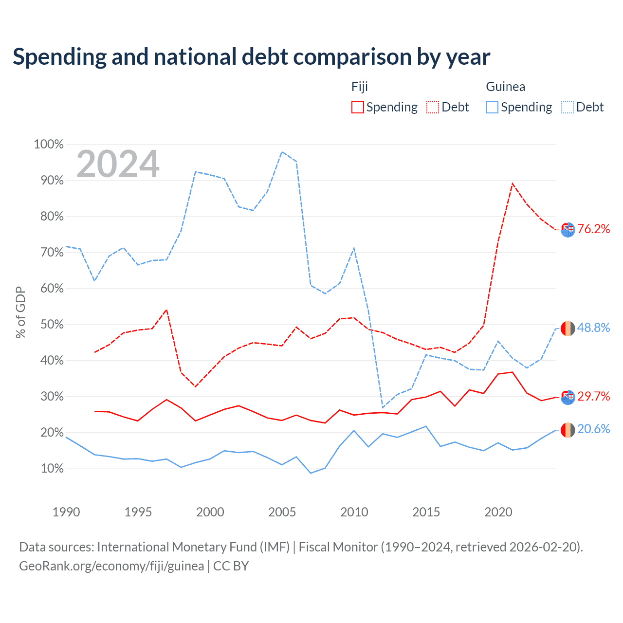 Fiji has $4.54B in government debt (76.2% of GDP), compared to $12.2B (48.8% of GDP) in Guinea.