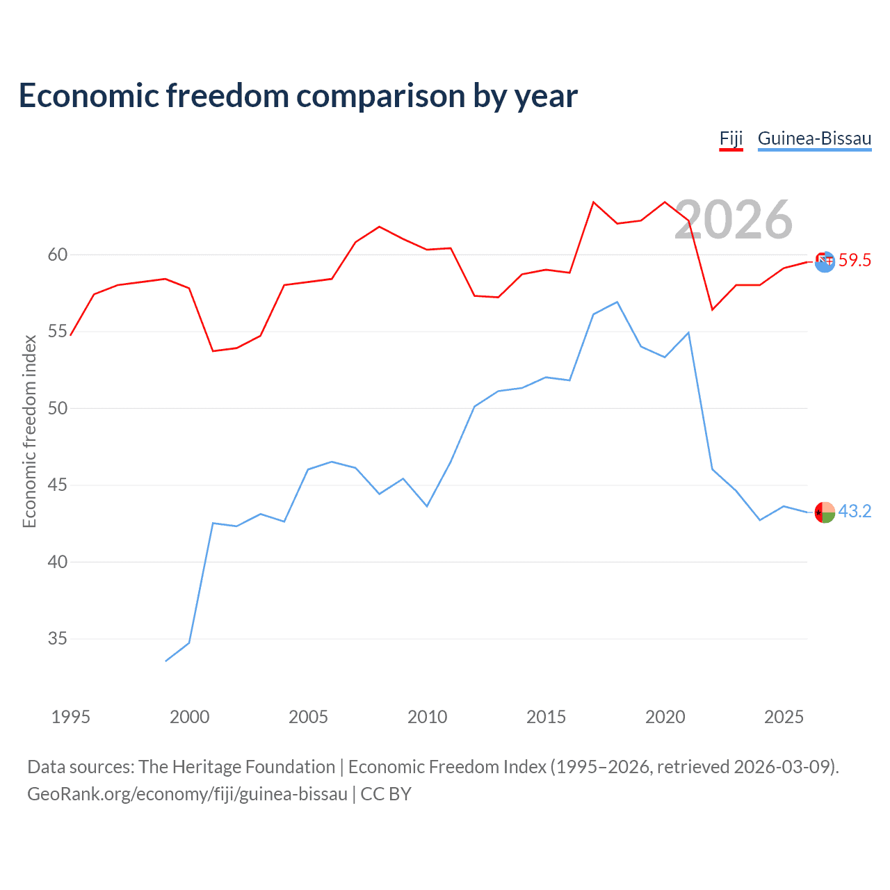 The Economic Freedom Index for Fiji is 59.5, ranking 103/197, compared to 43.2 for Guinea-Bissau, ranking 181/197. The chart above displays a comparison of annual changes in economic freedom indexes.