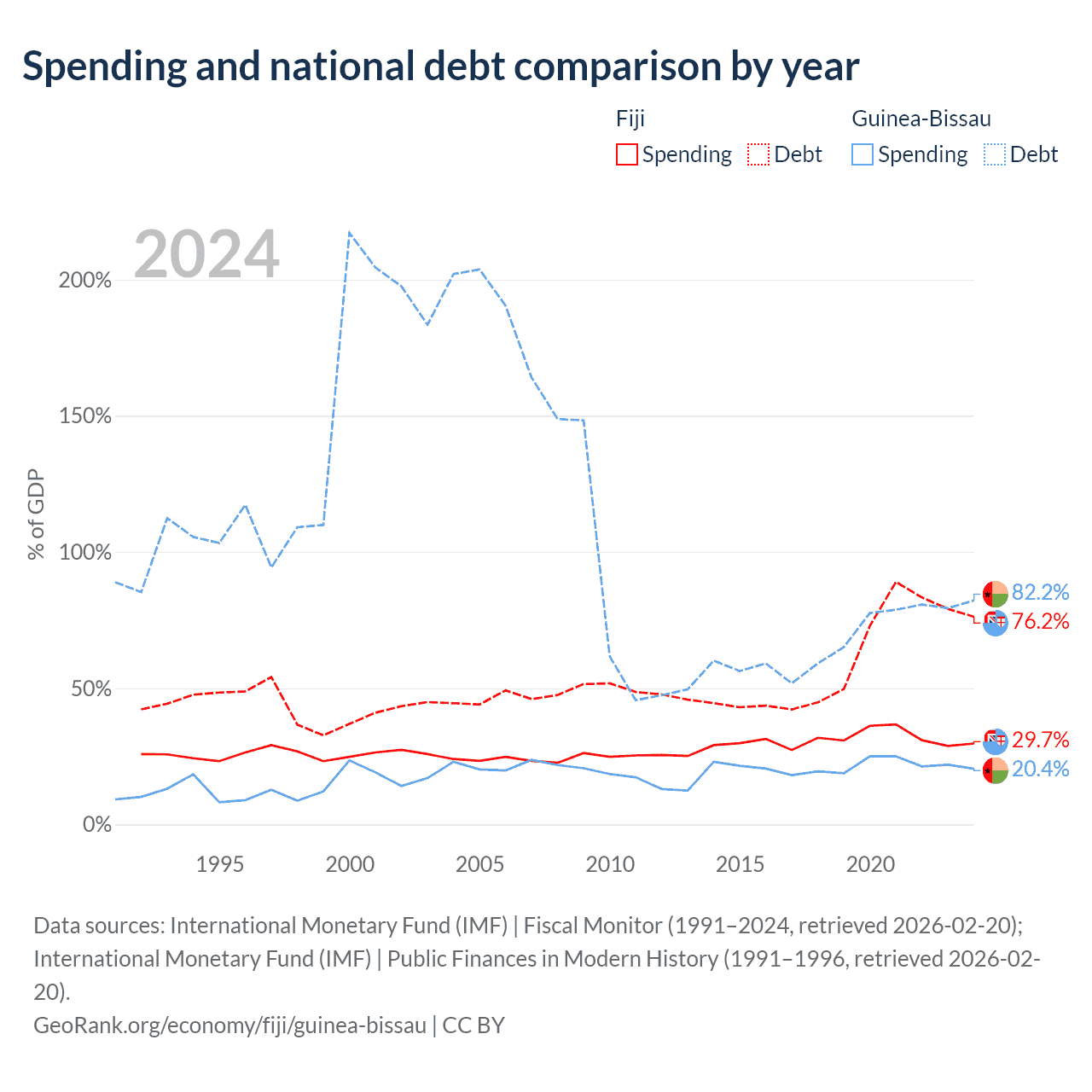 Fiji has $4.54B in government debt (76.2% of GDP), compared to $1.82B (82.2% of GDP) in Guinea-Bissau.