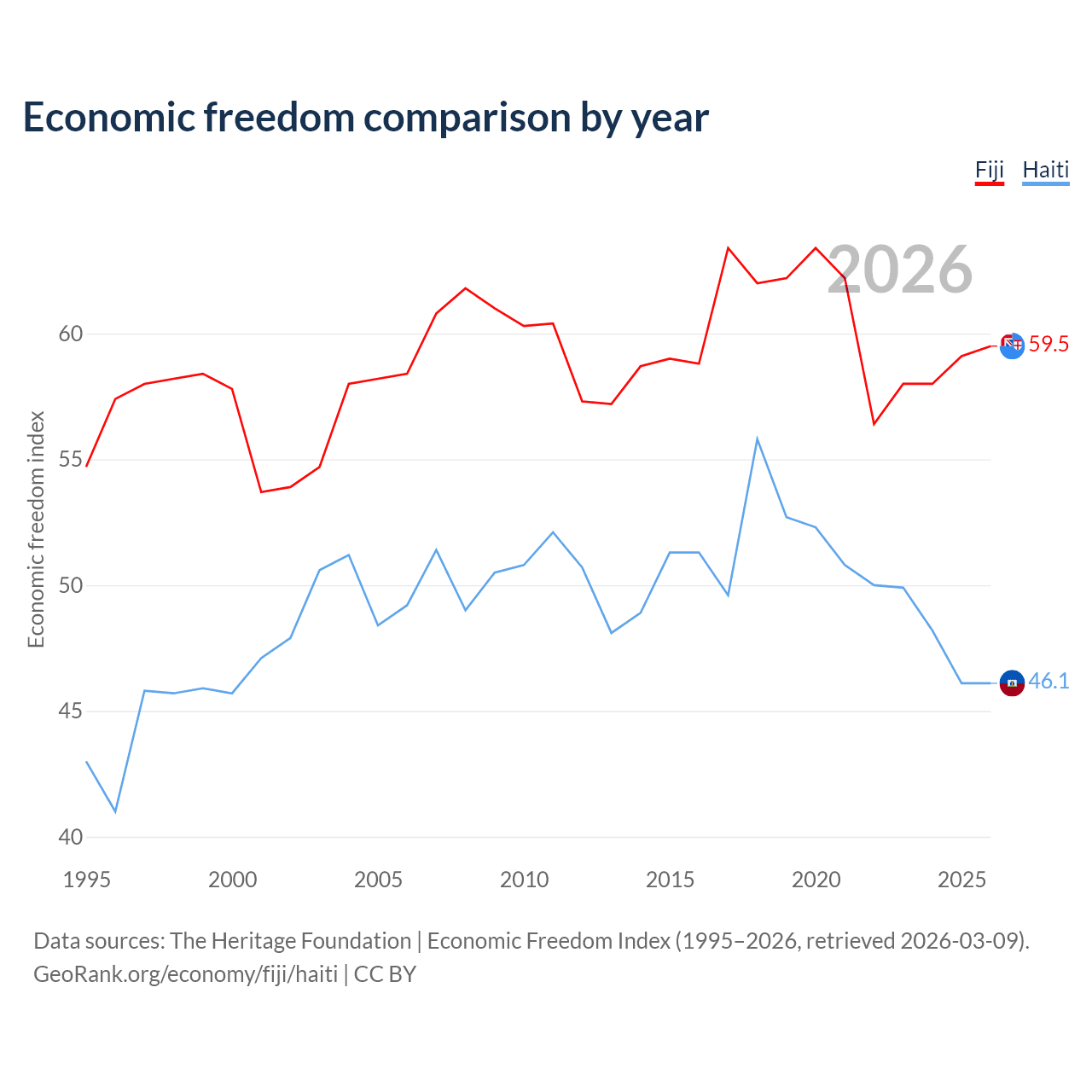 The Economic Freedom Index for Fiji is 59.5, ranking 103/197, compared to 46.1 for Haiti, ranking 178/197. The chart above displays a comparison of annual changes in economic freedom indexes.