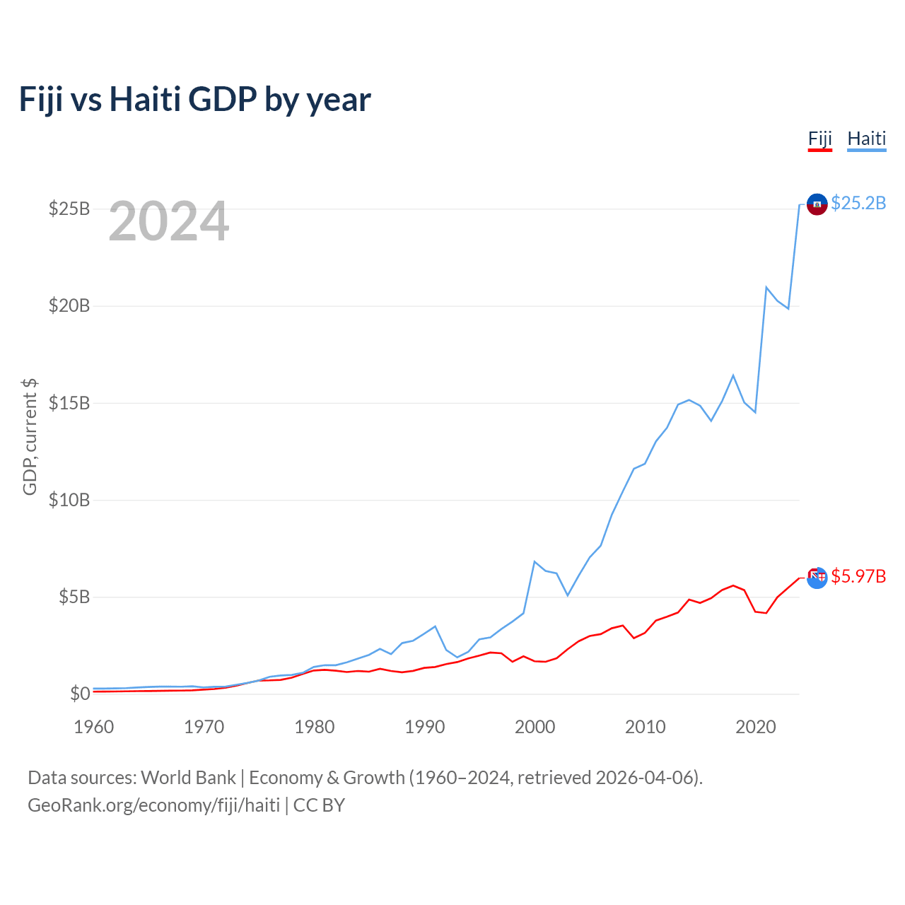 Fiji has a GDP of $5.97B compared to $25.2B for Haiti, ranking 161/197 and 117/197 by economy size, respectively.