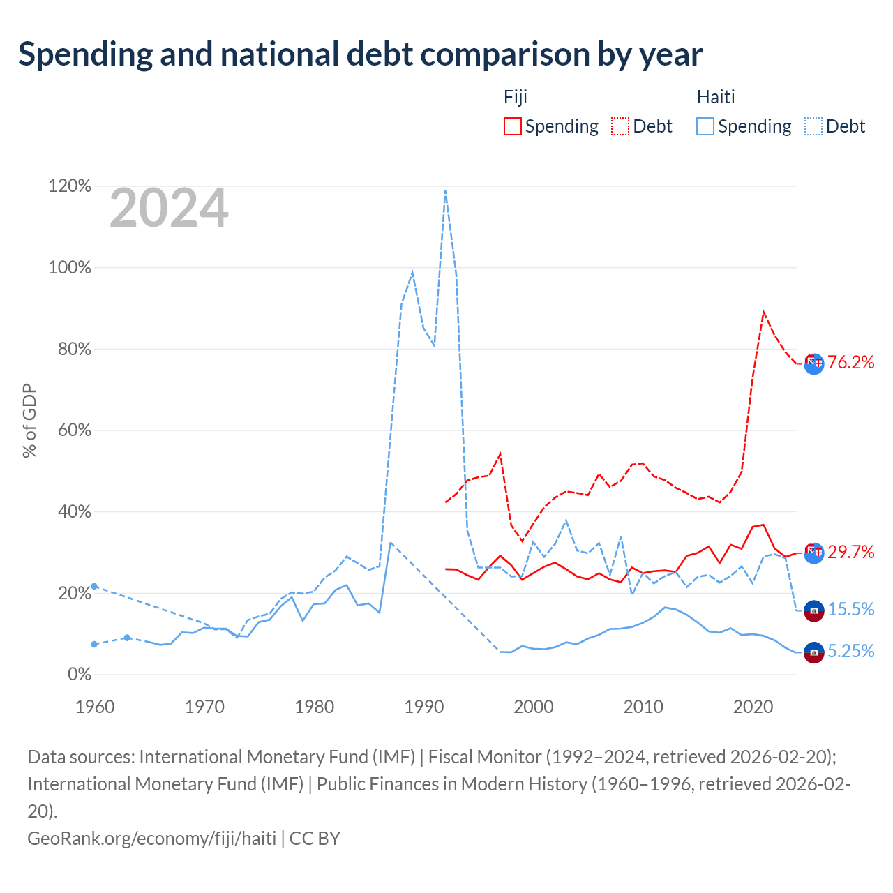 Fiji has $4.54B in government debt (76.2% of GDP), compared to $3.91B (15.5% of GDP) in Haiti.
