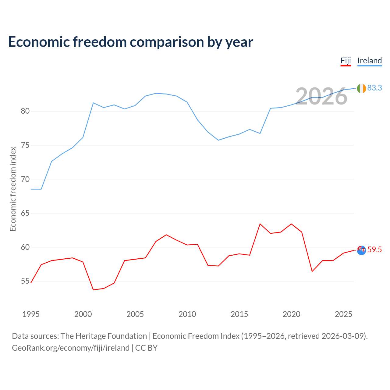 The Economic Freedom Index for Fiji is 59.5, ranking 103/197, compared to 83.3 for Ireland, ranking 3/197. The chart above displays a comparison of annual changes in economic freedom indexes.