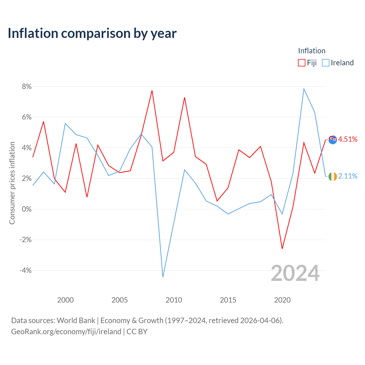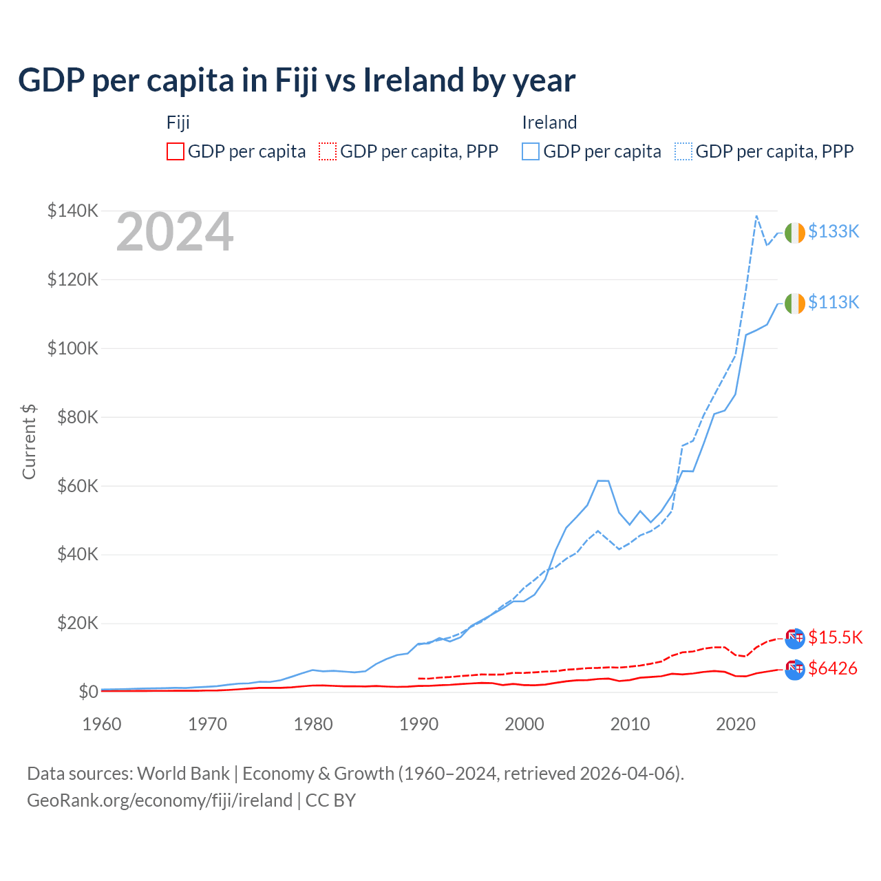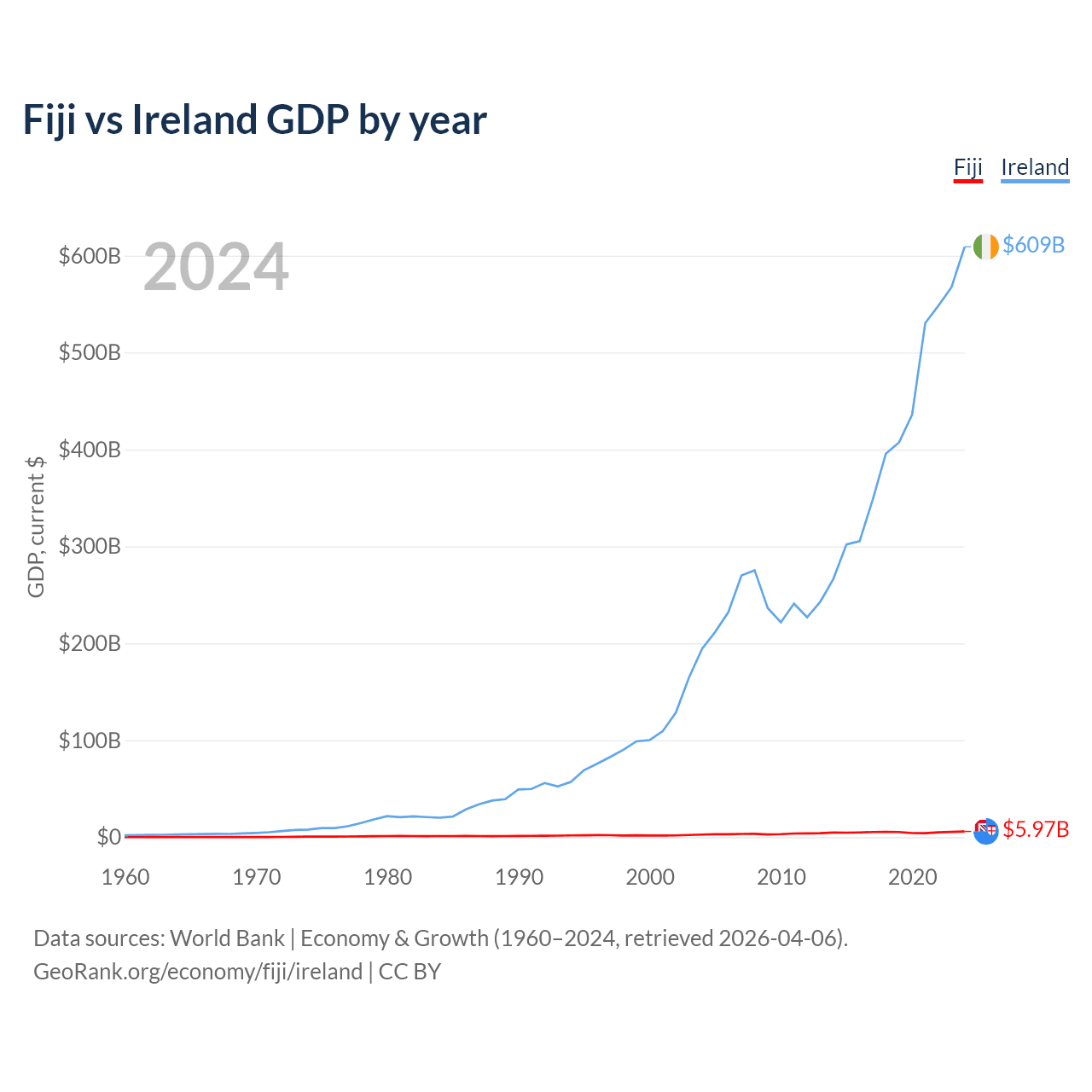 Fiji has a GDP of $5.97B compared to $609B for Ireland, ranking 161/197 and 25/197 by economy size, respectively.