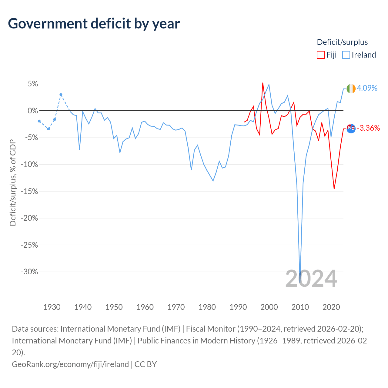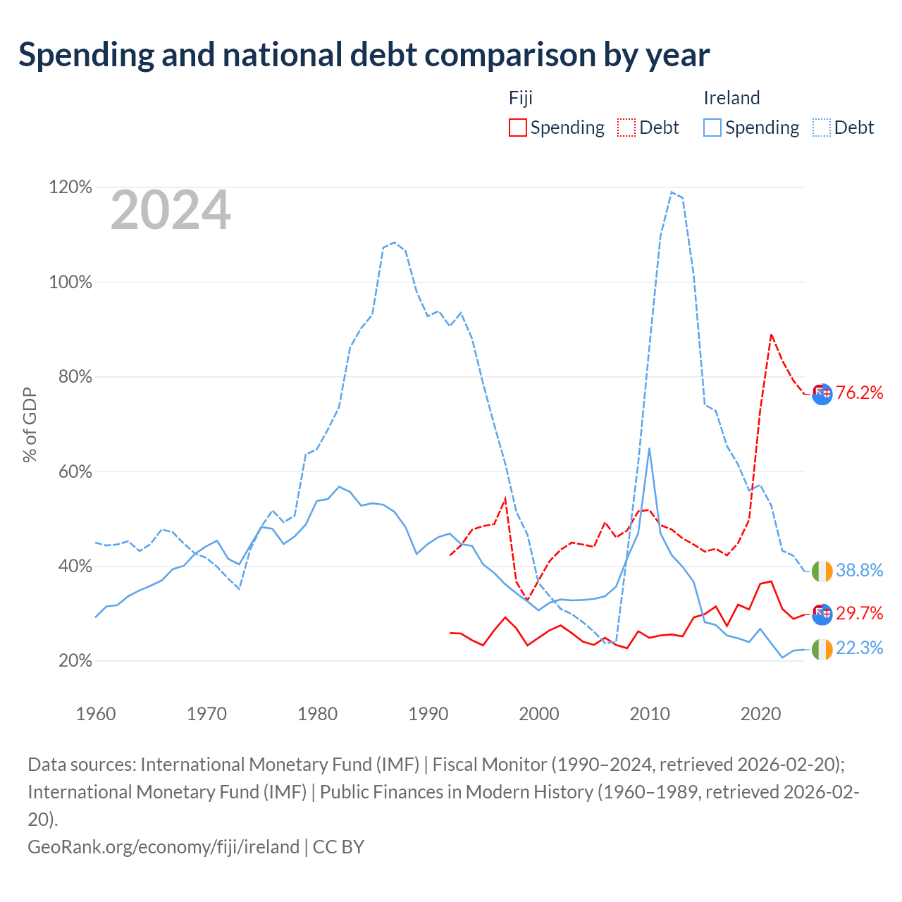 Fiji has $4.54B in government debt (76.2% of GDP), compared to $236B (38.8% of GDP) in Ireland.