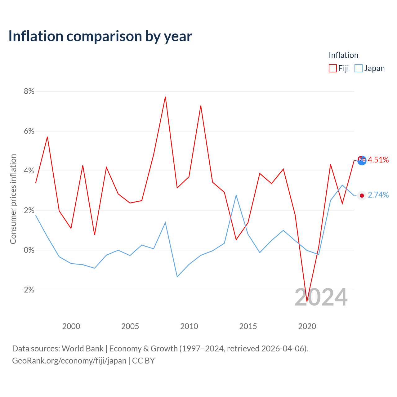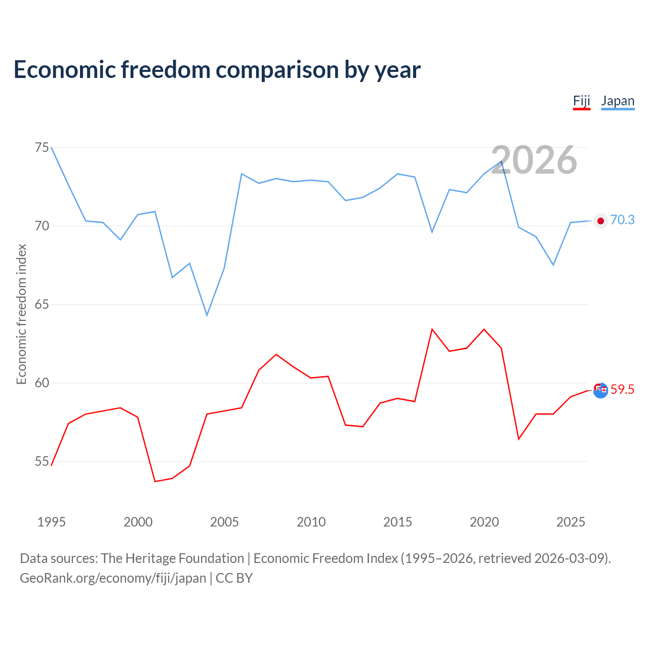 The Economic Freedom Index for Fiji is 59.5, ranking 103/197, compared to 70.3 for Japan, ranking 36/197. The chart above displays a comparison of annual changes in economic freedom indexes.