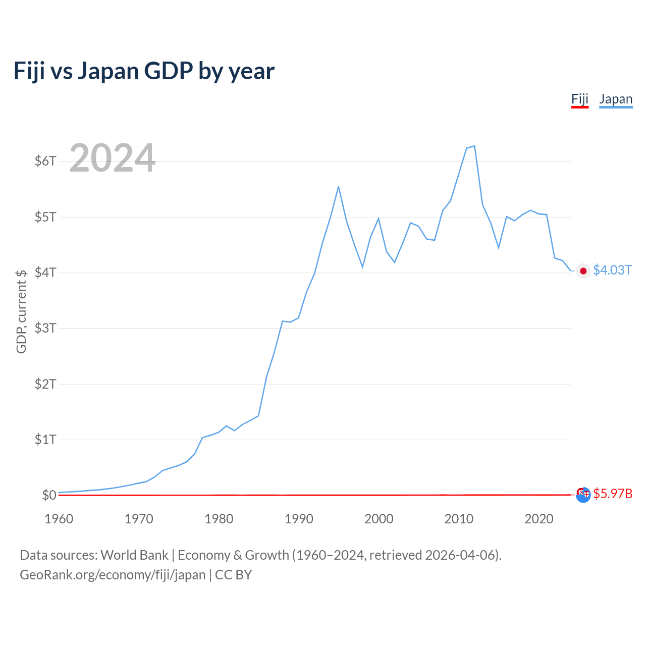 Fiji has a GDP of $5.97B compared to $4.03T for Japan, ranking 161/197 and 4/197 by economy size, respectively.