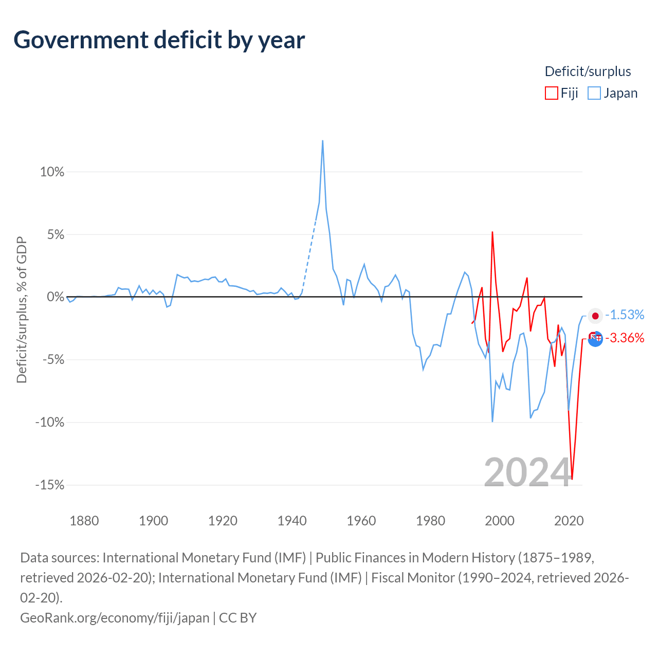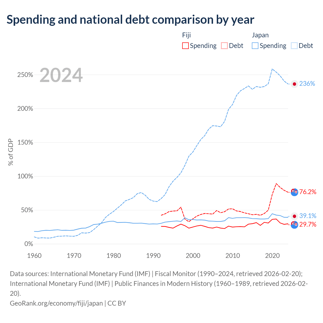 Fiji has $4.54B in government debt (76.2% of GDP), compared to $9.51T (236.1% of GDP) in Japan.