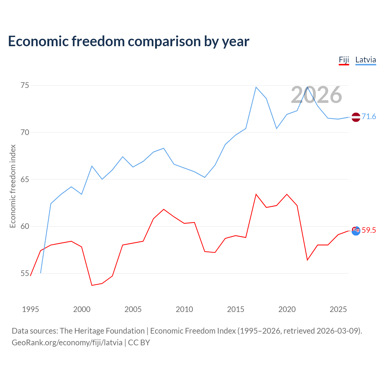 The Economic Freedom Index for Fiji is 59.5, ranking 103/197, compared to 71.6 for Latvia, ranking 31/197. The chart above displays a comparison of annual changes in economic freedom indexes.
